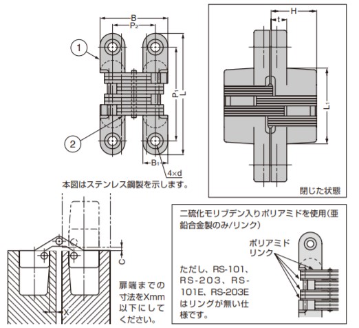 ●小型のRS-100、RS-100Eが新しく加わりました。 ●リンク部分に自己潤滑性に優れた二硫化モリブデン強化ポリアミドを使用し、長期間スムーズに開閉します(亜鉛合金製のみ)。 ●小型軽量扉から中量扉に適した丁番です。 ●木製扉、金属製扉にも使用できます。 【注意】 ●使用するクローザーによっては、動きが悪くなったり、扉が閉まりきらなくなる場合がありますので事前にご確認ください。 ●選定の目安より、扉サイズから丁番個数を決めてください。 ●RS-100、RS-100Eの耐荷重は、2ヶ使いのとき0.85kgf、3ヶ使いのとき1kgfです。 【付属品】 ●十字穴付木ねじ 【材料】 (1)本体:亜鉛合金 (2)アーム:鋼 —リンク:二硫化モリブデン入りポリアミド 【仕上】 (1)本体:電着塗装/ブラック (2)アーム:電着塗装/ブラック —リンク:- 【サイズ】 L:L?:B:B?:P?:P?:H:t:d:C:X:扉厚 44.4:19.0:34.5:12.7:31.7:21.8:18.2:4.7:φ3.8穴φ6.9皿:0.8:3.1:19以上 【開き角度】180度 【重量】53g 【注文コード】170-014-691 【品番】RS-203E 付属ねじ:3.5×25 [ 輸入 ] このマークの製品は輸入品のため「寸法・色調・作動感のばらつき」や、予告なく仕様変更等を行う場合があります。 製品内容は、部品としての品質範囲です。この部品を使用した最終製品の機能・性能・安全を保証するものではありません。 ※画像はイメージです。 ※パッケージ、仕様、品番などの変更が予告なく変更される場合が御座います。 カテゴリー |