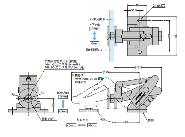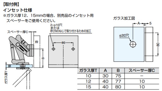 ●施工後に扉の三次元調整ができます。 ●開閉を繰り返しても調整が緩みにくい構造です。 【仕様】 ●扉の三次元調整機能(前後±3mm、上下±6mm、かぶせ〔左右〕±6mm) ●使用温度:5度〜35度 ●使用湿度:10%〜90% 【用途】 ●博物館・美術館・店舗の超大型ガラスショーケース ●商業施設の光壁 【注意】 ●ガラスサイズは耐荷重を優先して決めてください。 ●不特定多数の出入りのある扉としては使用しないでください。 ●扉は約90゜では止まらないため、これ以上開かないように戸当りを別途設けてください。 ●扉の比重や大きさ、形によって最大耐荷重まで使用できない場合がありますので、ご使用前に扉サイズの目安をご確認ください。 ●丁番は扉の上下から50〜100mmの位置に取り付けてください。 ●調整方法については、取扱説明書を必ずお読みください。 【推奨ねじ】 ●枠側:六角穴付ボルトM8 ガラス厚T:A:B:スペーサー厚C 10:30:75:— 12:40:77:10 15:40:80:10 ガラス厚T:かぶせ量E 10:0〜20 12:0〜20 15:6〜20 19:14〜20 【材料】 ガラス繊維入プラスチック 【色】 ブラック 【サイズ】 ガラス厚:10、12、15(19:受注対応) 【開き角度】90度 【耐荷重N】981 /2ヶ 【耐荷重kgf】100 /2ヶ 【注文コード】170-027-450 【品番】MFH-100B-01-03 [ 輸入 ] このマークの製品は輸入品のため「寸法・色調・作動感のばらつき」や、予告なく仕様変更等を行う場合があります。 製品内容は、部品としての品質範囲です。この部品を使用した最終製品の機能・性能・安全を保証するものではありません。 ※画像はイメージです。 ※パッケージ、仕様、品番などの変更が予告なく変更される場合が御座います。 カテゴリー |