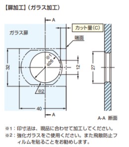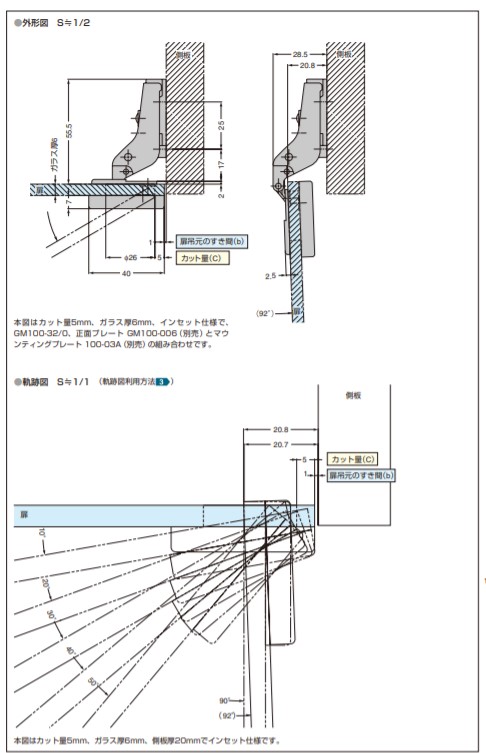 90度開き インセット カップ径φ26ガラス厚4〜6mm 取付座金100シリーズ 【別売品】 ●100シリーズマウンティングプレート(取付座金) ●GM100用正面プレート 写真はスライド丁番本体と別売のマウンティングプレートと正面プレートの組み合わせです。 【カット量(C)と扉吊元のすき間(b)の関係】表-1 カット量(C):5 扉吊元のすき間(b):1 カット量は5mmのみです。かぶせ量調節ねじで、隙間を調整できます。 【オープニングクリアランス(O.C.)目地代】 スライド丁番使用時には必ず扉先端のO.C.(A)と扉吊元のO.C.(B)が必要ですが、ガラス扉用丁番においては、扉厚(ガラス厚)が木製扉に比べて非常に薄くなっているため、扉吊元のO.C.(B)は0です。また、扉先端のO.C.(A)も0.1mm以下です。 【扉加工】ガラス加工 ※1:印寸法は、現品に合わせて加工してください。 ※2:強化ガラスをご使用ください。また飛散防止 フィルムを貼ることをお勧めします。 【扉の寸法と丁番の取付個数】 上図はあくまでも目安としてください。 丁番取り付けの際、上図のL寸法を大きく取ると強度的に有利です。 【仕様】 キャッチ付 【材料】 本体 亜鉛合金(ZDC)、カップ/ポリアミド(PA) 【色】 カップ/ブラック 【仕上】 本体/サチライトクロムめっき 【注文コード】160-083-053 【品番】GM100-C32/0 取り付けには別売のマウンティングプレートと正面プレートが必要です。別途ご注文ください。 製品内容は、部品としての品質範囲です。この部品を使用した最終製品の機能・性能・安全を保証するものではありません。 ※画像はイメージです。 ※パッケージ、仕様、品番などの変更が予告なく変更される場合が御座います。 カテゴリー |