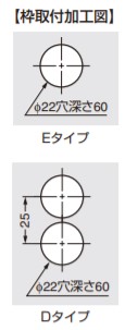 枠(側板)の上端または下端から約60mmの枠厚中心位置に、φ22mm、深さ60mmの穴加工を行い、ヒンジのチューブ部分を埋め込み、ねじ止めしてください。