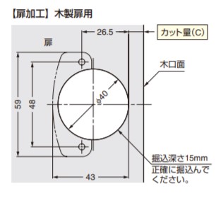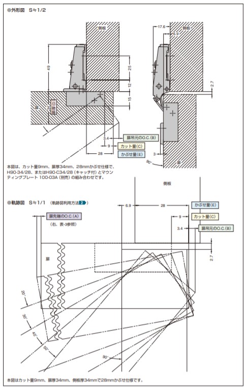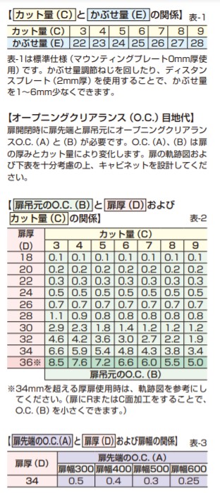 90度開き 28mmかぶせ 適応かぶせ量19〜28mm カップ径φ40掘込深さ15mm推奨扉厚18〜34mm 取付座金100シリーズ 【別売品】 ●100シリーズマウンティングプレート(取付座金) 【推奨ねじ】 ●呼び径3.5皿、または丸皿頭タッピンねじ、または木ねじ 写真はスライド丁番本体と別売のマウンティングプレートの組み合わせです。 【カット量(C)とかぶせ量(E)の関係】表-1 カット量(C):3:4:5:6:7:8:9 かぶせ量(E):22:23:24:25:26:27:28 表-1は標準仕様(マウンティングプレート0mm厚使用)です。 かぶせ量調節ねじを回したり、ディスタンスプレート(2mm厚)を使用することで、かぶせ量を1〜6mm少なくできます。 【オープニングクリアランス(O.C.)目地代】 扉開閉時に扉先端と扉吊元にオープニングクリアランスO.C.(A)と(B)が必要です。 O.C.(A)、(B)は扉の厚みとカット量により変化します。扉の軌跡図および下表を十分考慮の上、キャビネットを設計してください。 【扉吊元のO.C.(B)と扉厚(D)およびカット量(C)の関係】表-2 扉厚(D):カット量(C)(3:4:5:6:7:8:9) 18:0.1:0.1:0.1:0.1:0.1:0.1:0.1 20:0.2:0.2:0.2:0.2:0.2:0.2:0.2 22:0.3:0.3:0.3:0.3:0.3:0.3:0.3 24:0.5:0.5:0.5:0.5:0.5:0.5:0.5 26:0.7:0.7:0.7:0.7:0.7:0.7:0.7 28:1.1:0.9:0.8:0.8:0.8:0.8:0.8 30:2.9:2.3:1.8:1.4:1.2:1.2:1.2 32:4.6:4.2:3.6:3.0:2.7:2.2:1.9 34:6.6:5.9:5.4:4.8:4.3:3.8:3.4 36※:8.5:7.6:7.2:6.6:6.0:5.5:5.0 扉吊元のO.C.(B) ※34mmを超える厚扉使用時は、軌跡図を参考にしてください。(扉にRまたはC面加工をすることで、O.C.(B)を小さくできます。) 【扉先端のO.C.(A)と扉厚(D)および扉幅の関係】表-3 扉厚(D):扉先端のO.C.(A)(扉幅300:扉幅400:扉幅500:扉幅600) 34:0.5:0.4:0.3:0.25 【仕様】 キャッチなし 【材料】 本体/鋼、カップ/亜鉛合金(ZDC) 【仕上】 サチライトクロムめっき 【注文コード】160-073-576 【品番】H90-34/28 取り付けには別売のマウンティングプレートと正面プレートが必要です。別途ご注文ください。 製品内容は、部品としての品質範囲です。この部品を使用した最終製品の機能・性能・安全を保証するものではありません。 ※画像はイメージです。 ※パッケージ、仕様、品番などの変更が予告なく変更される場合が御座います。 カテゴリー |