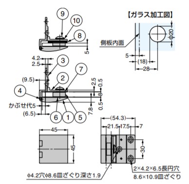 ●かぶせ扉用のガラス丁番で、ショーケースなどの使用に適しています。 ●取り付け後に扉の調整が可能です(上下±1mm、左右±1.2mm)。 【注意】 ●ガラスサイズは耐荷重を優先して決めてください。 ●キャッチ無しタイプです。キャッチ付タイプはGH-456C型をご覧ください。 【推奨ねじ】 ●呼び4皿タッピンねじ、または呼び3.8皿木ねじ 【ガラス厚とスペーサーの枚数】 ガラス厚:5:6:8 スペーサーの枚数:3:2:なし 【材料】 (1)正面プレート:黄銅 (2)押えプレートB:黄銅 (3)受座:黄銅 (4)軸:ステンレス鋼(SUS303) (5)調整コマ:ポリアミド(PA) (6)ガラス押えA:クロロプレンゴム(CR) (7)ガラス押えB:クロロプレンゴム(CR) (8)スペーサー小:ポリプロピレン(PP) (9)十字穴付トラス小ねじ:ステンレス鋼 (10)ばね座金:ステンレス鋼 【色】 (1)正面プレート:- (2)押えプレートB:- (3)受座:- (4)軸:- (5)調整コマ:ブラック (6)ガラス押えA:ブラック (7)ガラス押えB:ブラック (8)スペーサー小:ブラック (9)十字穴付トラス小ねじ:- (10)ばね座金:- 【仕上】 (1)正面プレート:クロムめっき (2)押えプレートB:クロムめっき (3)受座:クロムめっき (4)軸:素地 (5)調整コマ:- (6)ガラス押えA:- (7)ガラス押えB:- (8)スペーサー小:- (9)十字穴付トラス小ねじ:- (10)ばね座金:- 【サイズ】 扉幅:600以下 扉高さ:1200以下 ガラス厚:5、6、8 【耐荷重N】148 /2ヶ 【耐荷重kgf】15 /2ヶ 【注文コード】170-090-703 【品番】GH-456N-CR 製品内容は、部品としての品質範囲です。この部品を使用した最終製品の機能・性能・安全を保証するものではありません。 ※画像はイメージです。 ※パッケージ、仕様、品番などの変更が予告なく変更される場合が御座います。 カテゴリー |