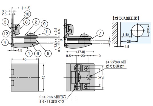 ●インセット扉用のガラス用丁番で、ショーケースなどの使用に適しています。 ●取り付け後に扉の調整が可能です(上下±1mm、左右±1.2mm)。 ●ガラス錠1310GL型、1310GLW型との併用を推奨します。 【注意】 ●ガラスサイズは耐荷重を優先して決めてください。 【推奨ねじ】 ●呼び4皿タッピンねじ、または呼び3.8皿木ねじ 【ガラス厚とスペーサーの枚数】 ガラス厚:5:6:8 スペーサーの枚数:3:2:なし 【材料】 (1)正面プレート:黄銅 (2)押えプレートA:黄銅 (3)受座:黄銅 (4)軸:ステンレス鋼(SUS303) (5)調整コマ:ポリアミド(PA) (6)ガラス押えA:クロロプレンゴムCR) (7)スペーサー大:ポリプロピレン(PP) (8)キャッチ:ポリアミド(PA) (9)十字穴付トラス小ねじ:ステンレス鋼 (10)十字穴付トラス小ねじ:ステンレス鋼 (11)ばね座金:ステンレス鋼 (12)ばね座金:ステンレス鋼 【色】 (1)正面プレート:- (2)押えプレートA:- (3)受座:- (4)軸:- (5)調整コマ:ブラック (6)ガラス押えA:ブラック (7)スペーサー大:ブラック (8)キャッチ:ブラック (9)十字穴付トラス小ねじ:- (10)十字穴付トラス小ねじ:- (11)ばね座金:- (12)ばね座金:- 【仕上】 (1)正面プレート:サテンニッケルめっき (2)押えプレートA:サテンニッケルめっき (3)受座:サテンニッケルめっき (4)軸:- (5)調整コマ:- (6)ガラス押えA:- (7)スペーサー大:- (8)キャッチ:- (9)十字穴付トラス小ねじ:- (10)十字穴付トラス小ねじ:- (11)ばね座金:- (12)ばね座金:- 【サイズ】 扉幅:600以下 扉高さ:1200以下 ガラス厚:5、6、8 【耐荷重N】148 /2ヶ 【耐荷重kgf】15 /2ヶ 【注文コード】170-090-699 【品番】GH-450-SN 製品内容は、部品としての品質範囲です。この部品を使用した最終製品の機能・性能・安全を保証するものではありません。 ※画像はイメージです。 ※パッケージ、仕様、品番などの変更が予告なく変更される場合が御座います。 カテゴリー |