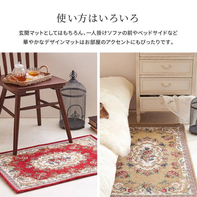 ●玄関マットとしてはもちろん、一人掛けソファの前やベッドサイドなど、華やかなデザインマットはお部屋のアクセントにもぴったりです。