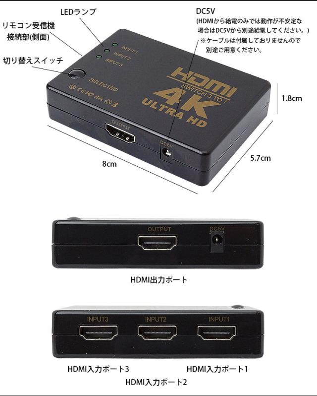 HDMI セレクター 3入力1出力 切替器 4K対応 リモコン付き 手動切替 ゲーム機 パソコン PC テレビ モニター PR-HD-SW31【メール便 送料無料】