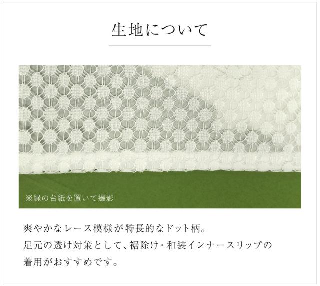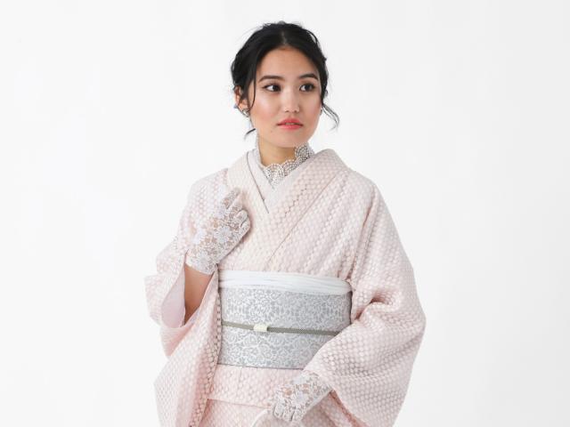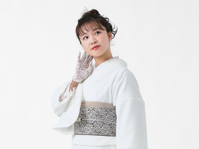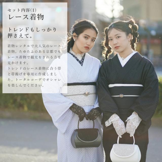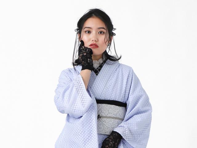 上品な可愛らしさが人気のレース素材。和装では足袋や半衿など小物の印象が強いですが、昨今レンタルをはじめレース着物の人気が高まっています。和のストーリーを伝えるたゆたふのユニット『WA・ST Girl(ワストガール)』の二人と一緒に商品開発をした着物と半巾帯と帯揚げの3点セットです。