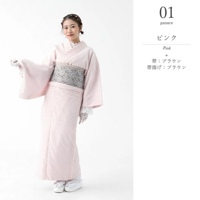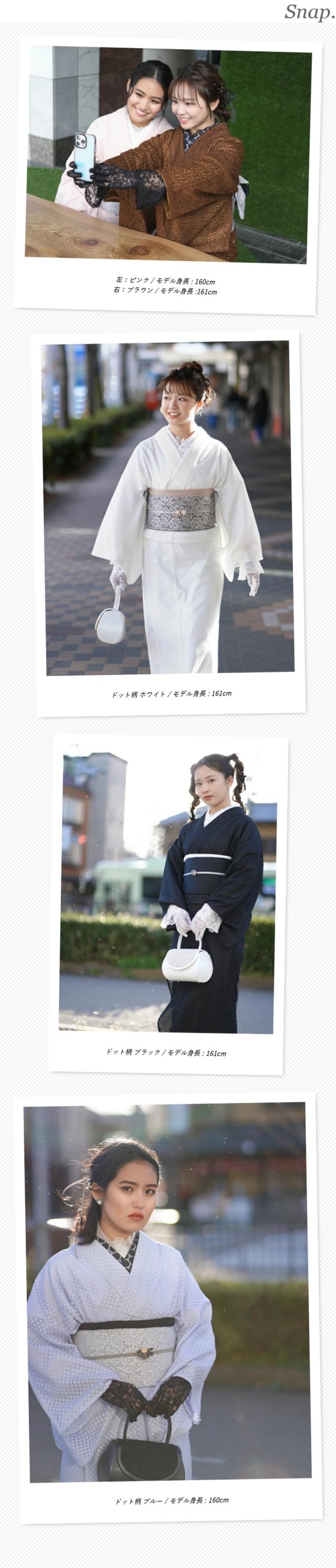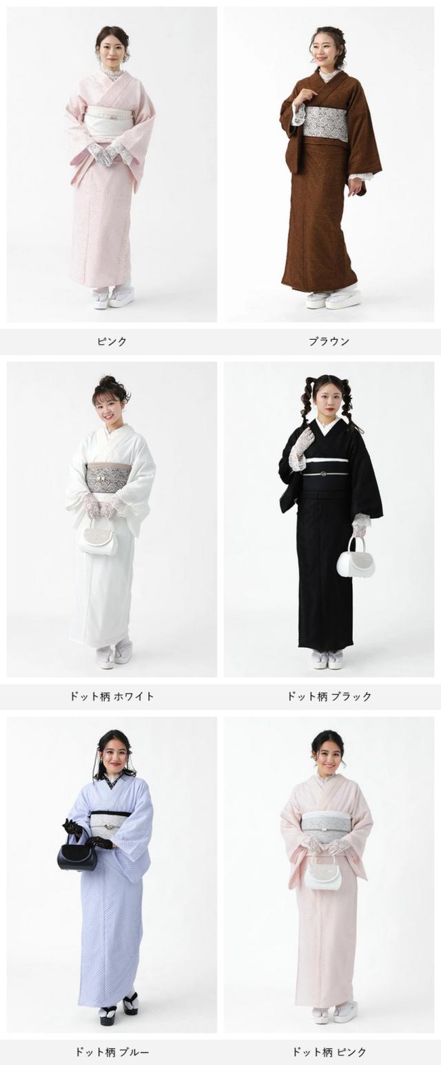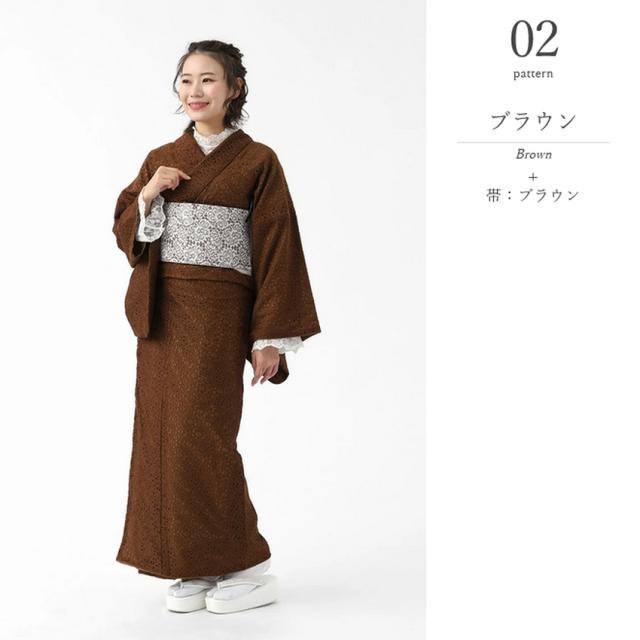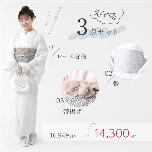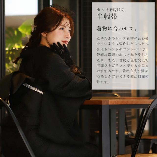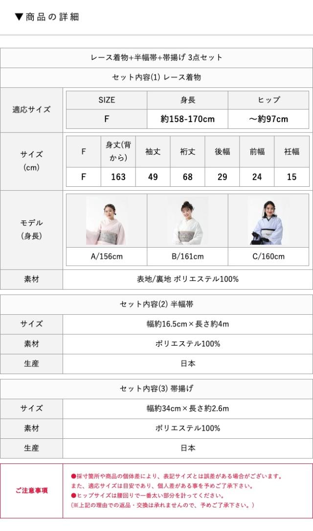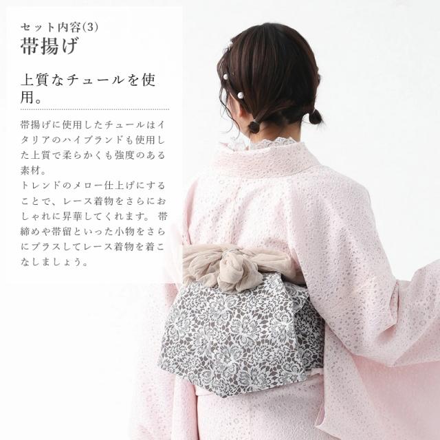 レース着物 半幅帯 帯揚げ 3点セット お仕立て上がり レディース 袷 フリー 【 きもの おび おびあげ セット レース 女性 春 秋 おしゃれ かわいい 可愛い 白 黒 ピンク 水色 ブラウン フリーサイズ 双子コーデ ガーリー ポリエステル 】