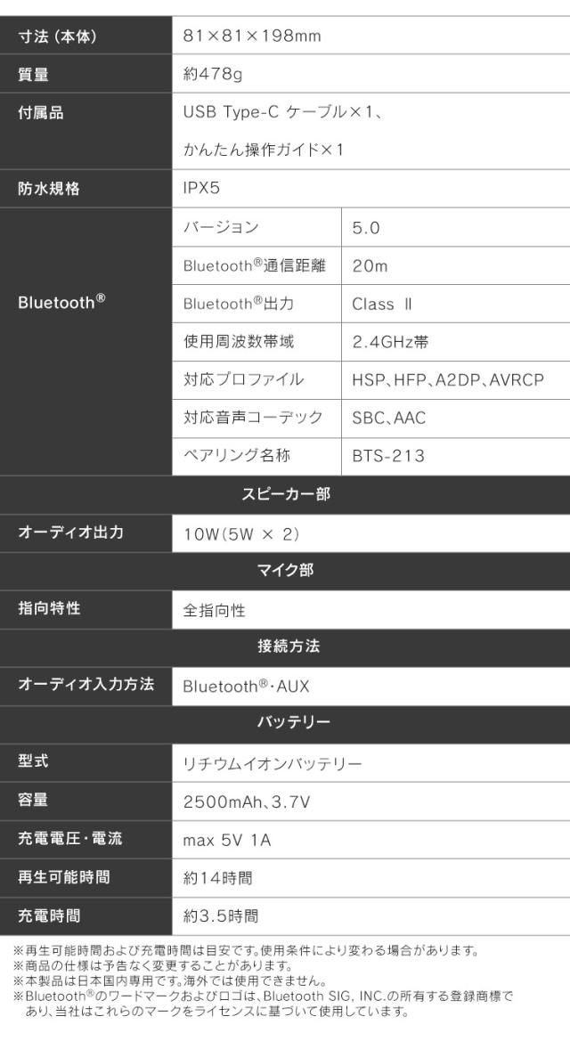 ■仕様:防水(IPX5)、ステレオ、複数同時ペアリング