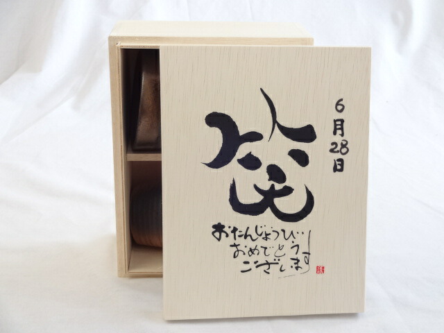 誕生日6月28日セット おたんじょうびおめでとうございます 笑う門には福来たる木箱珈琲マグカップセット(国産備前金彩マグカップと挽き立て特注ハッピーブレンド珈琲豆180g) 陶芸作家 安藤嘉規作×デザイン書道家 榮田 清峰作