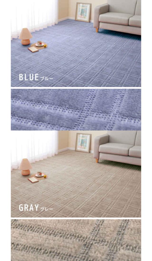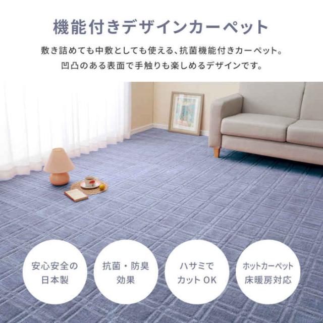 敷き詰めても中敷でもつかえる抗菌機能付きデザインカーペット。本間4.5畳 286×286cm。カラーは、ブルー(4955872857541/600098445)、グレー(4955872857794/600098745)です。ローループ&ハイカットで2パターンの肌触りを味わえるのが特徴。高級感があり、ペットやお子様のいるご家庭におススメです。