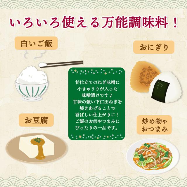 甘仕立てのねぎ味噌に小きゅうりが入った味噌漬けです。甘みの強い下仁田ねぎを焼きあげ、香ばしく仕上げています。ご飯のお供や酒のつまみなどにぴったりです。