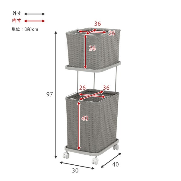 色柄物や汚れた洗濯物を分けて溜められるランドリーワゴン。バスケットは持ち運べて便利。 ■サイズ (約)幅30×奥行40×高さ97cm ■素材 主材:スチール、張地:ポリエチレン ■内寸及び補足説明 キャスター付 ※写真はメーカー様のカタログ等から掲載させて頂いております。 実物の商品と写真の色が若干写真写り等により異なる場合がありますのでご注意くださいませ。 万が一の際でございましても返品はお受け致しかねます。 ※写真に写っている小物などは付属しておりません。 ※お客様組立て品につきましては、組み立て後に不良の連絡をされても対応ができません。 組み立て前にパーツに不良・傷等がないか、必ずご確認下さいます様よろしくお願い申し上げます。 ※記載は商品仕様の一部です。仕様説明不足等の理由での返品はできません。特に適合等は必ずご確認ください。