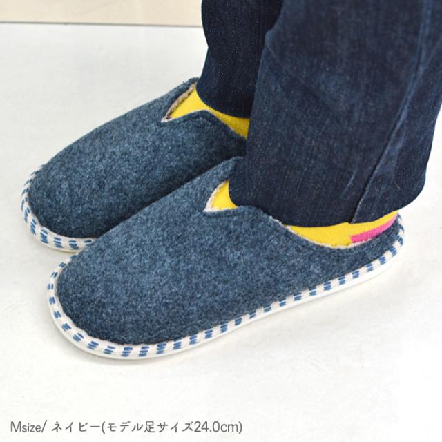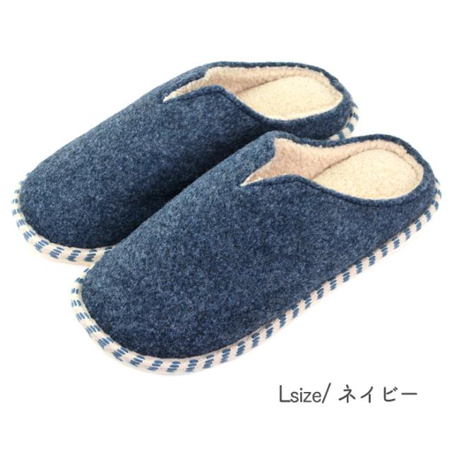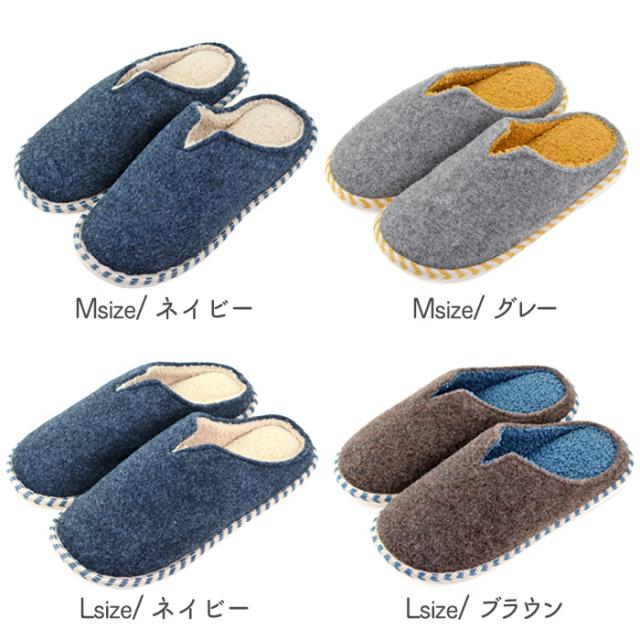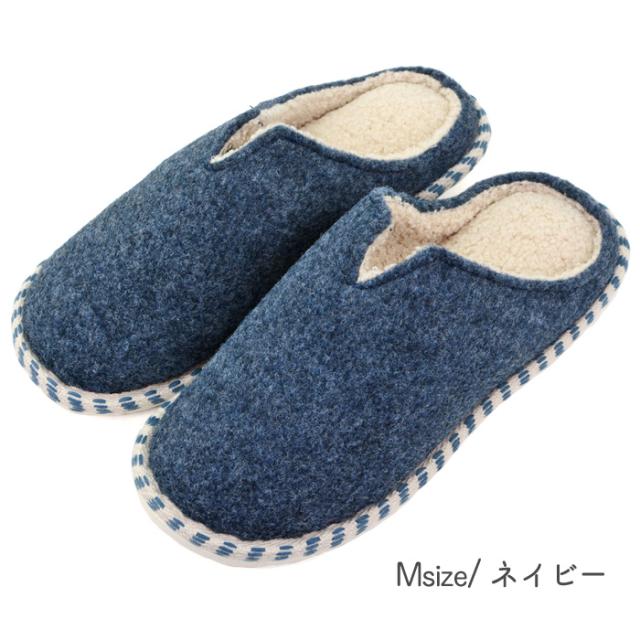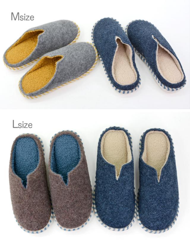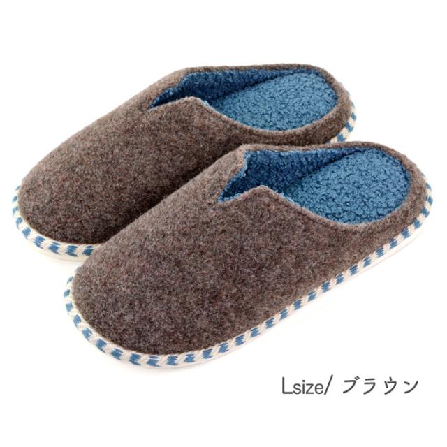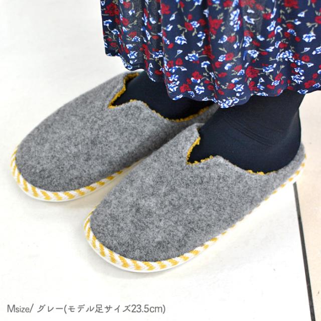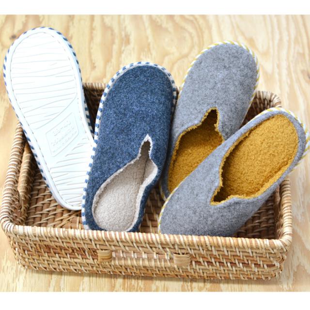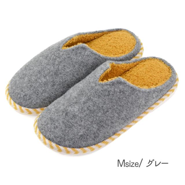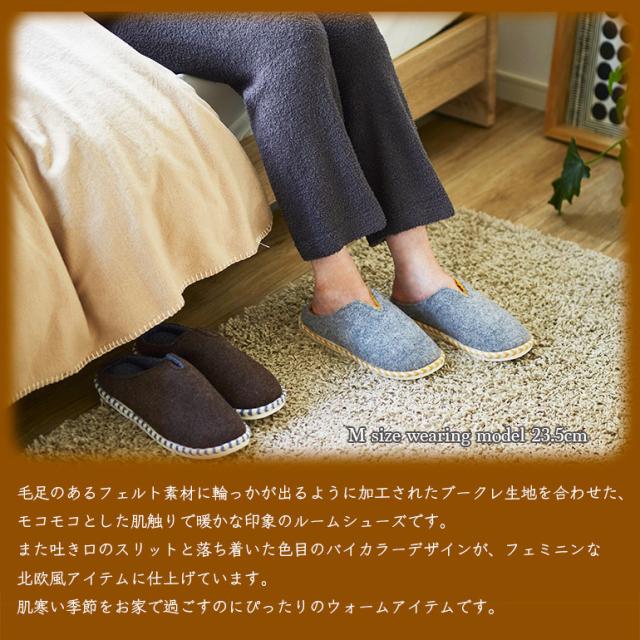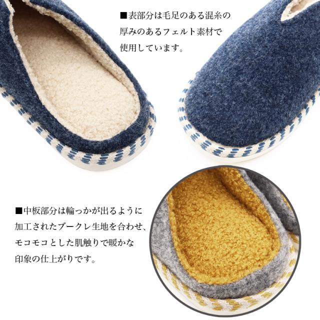 毛足のあるフェルト素材に輪っかが出るように加工されたブークレ生地を合わせた、モコモコとした肌触りで暖かな印象のルームシューズです。
