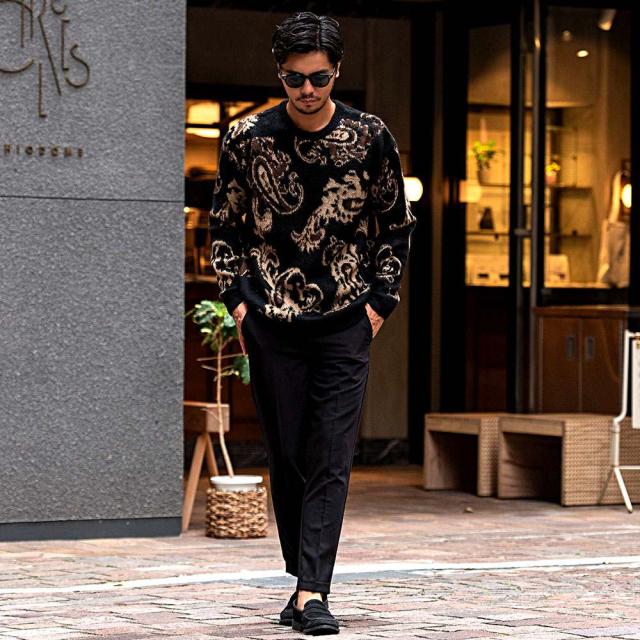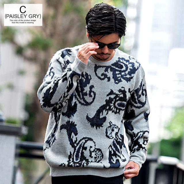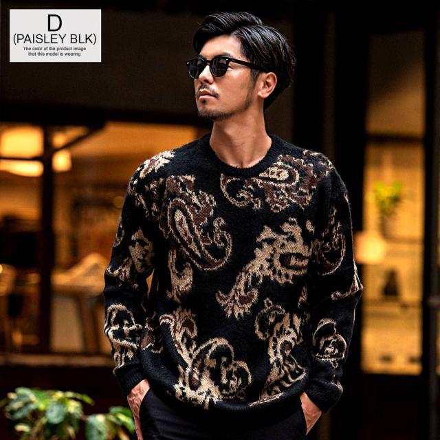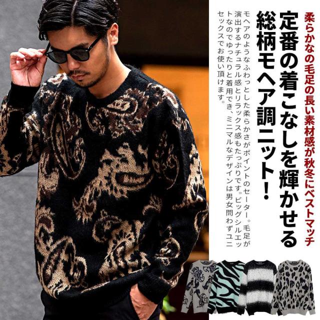 ニット メンズ セーター 厚手 ブランド 大人 おしゃれ オーバーサイズ モヘア モヘヤ ジャガード クルーネック モコモコ 暖かい 防寒着 豹柄 ヒョウ柄 総柄 ペイズリー ブラック 黒 ユニセックス 男 男性 秋 冬 秋冬 CavariA 20代 30代 40代 ファッション [CANG22-43]
