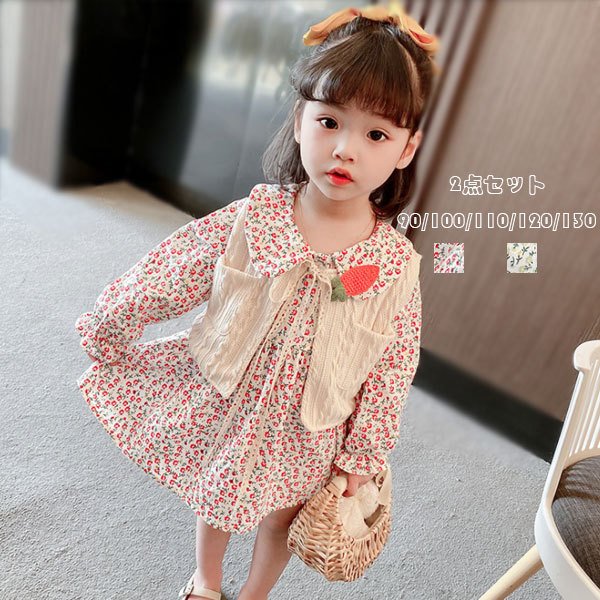 ワンピース 花柄 スウィート 結婚式 パーティー 女の子 ベビー ワンピース ベスト 2点セット 可愛い 幼児 長袖ワンピ 春 秋 大人気 ピンク グリーン 90-130