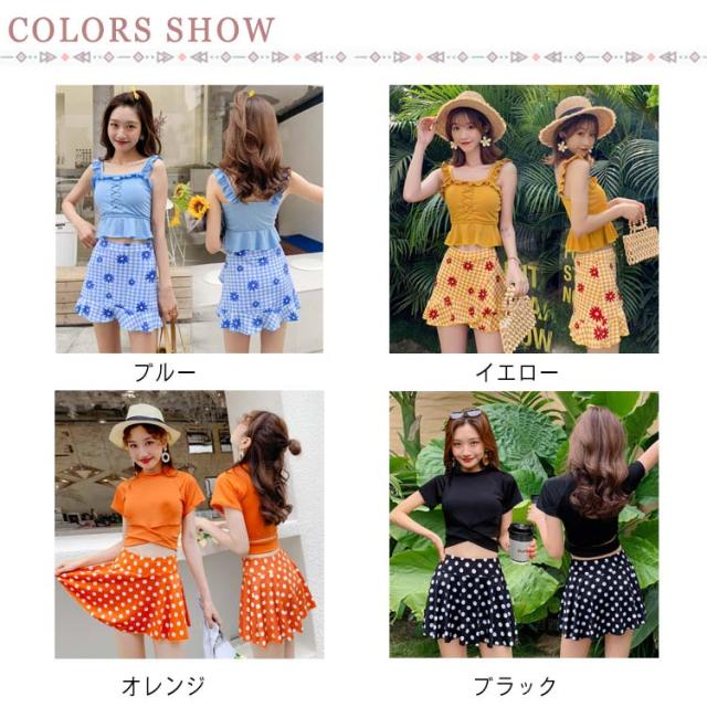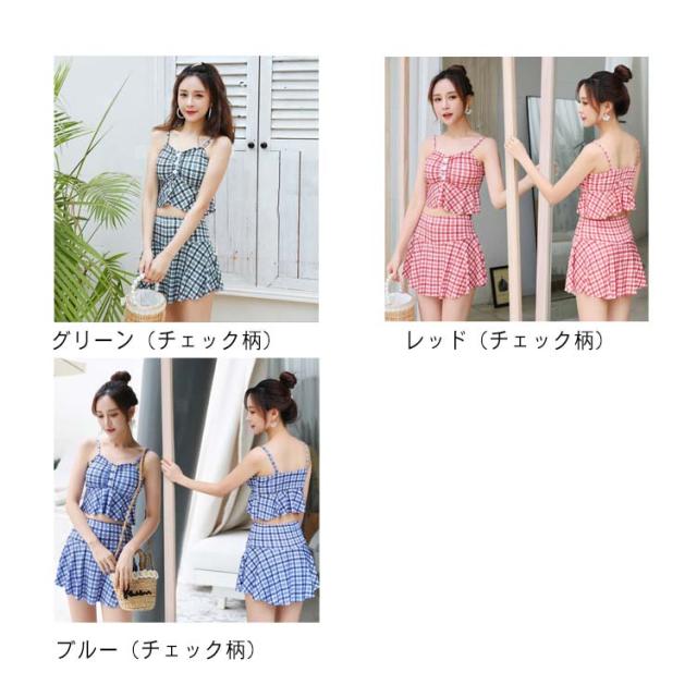 水着 レディース 体型カバー ワンピース ショートパンツ スカート セパレート サロペット オフショルダー スイムウェア タンキニ チェック柄 水玉 無地 2点セット 20代