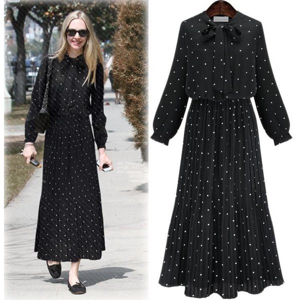 欧米風ドット柄¥/水玉柄 エレガント シフォン ロング マキシ ワンピース パーティ セレブ風スタイルレトロ調シャツワンピ ドレ