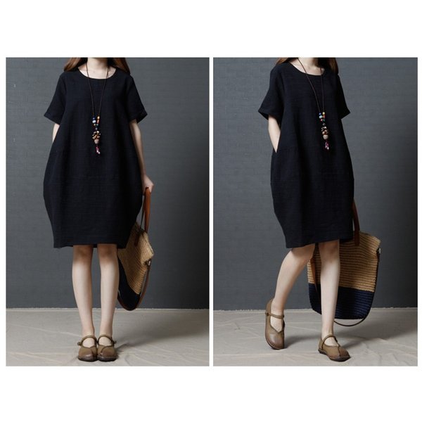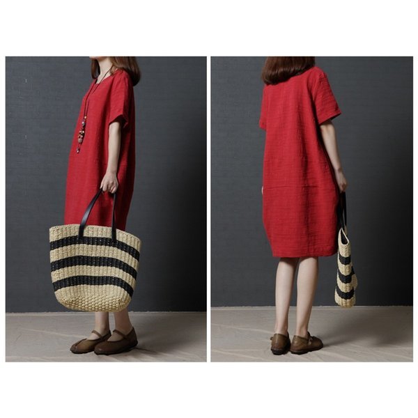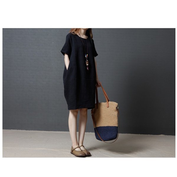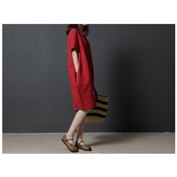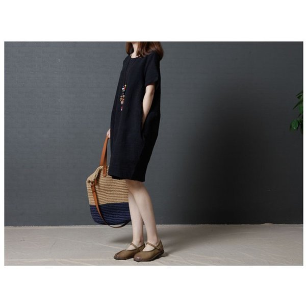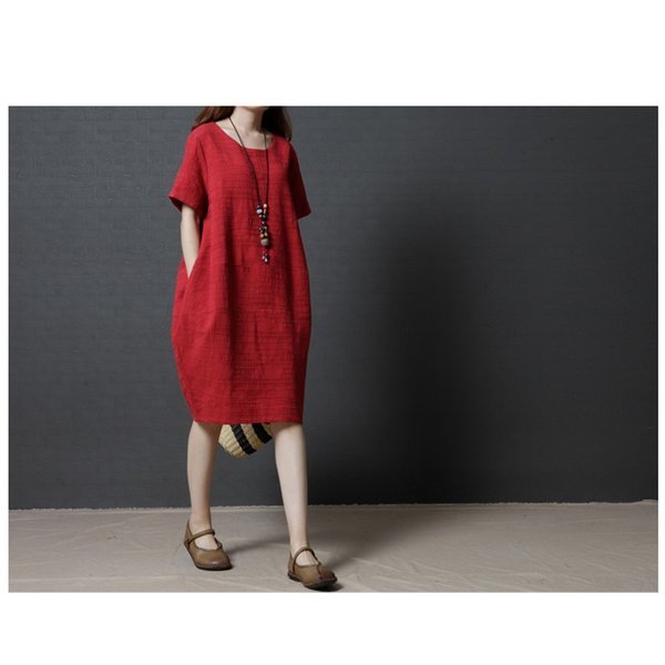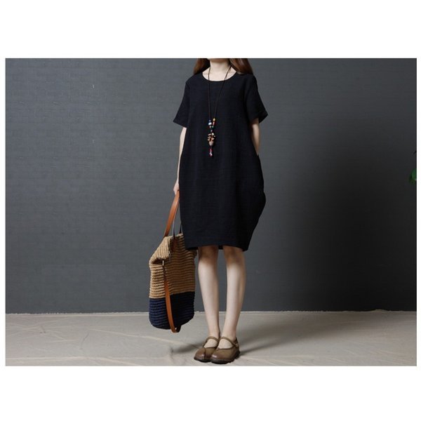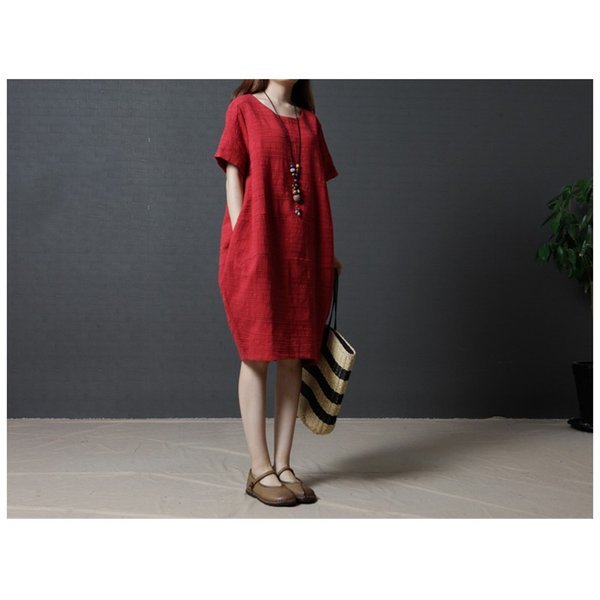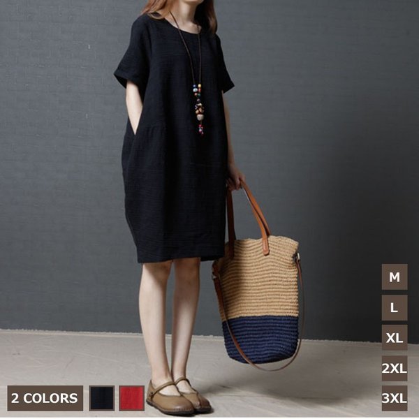 レディース 「」ワンピース 七分袖 丸襟 ブラック¥/レッド 自然 着痩せ 大きいサイズ 夏 カジュアル ゆったり 通勤 韓国ファション