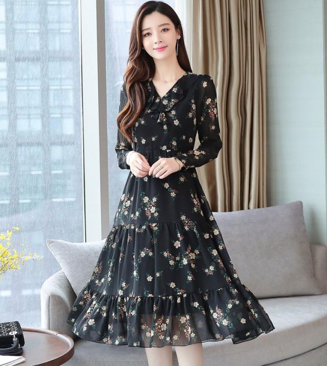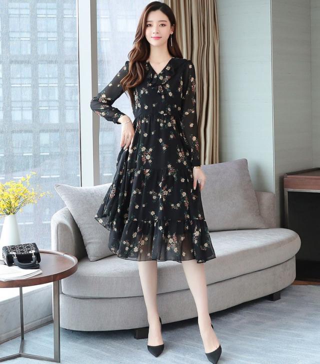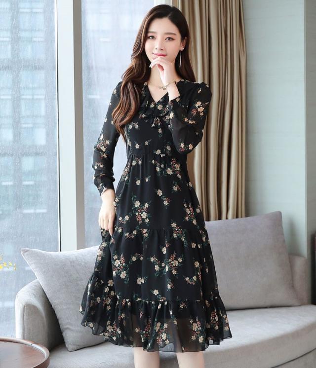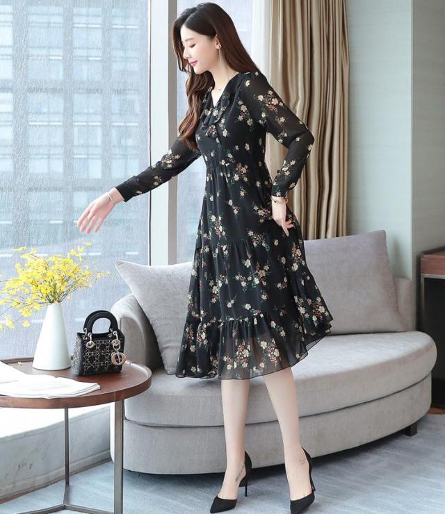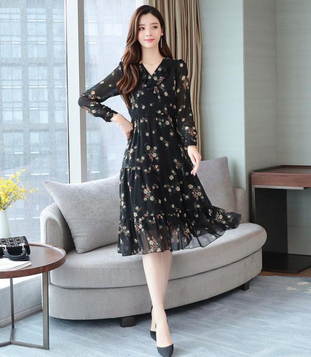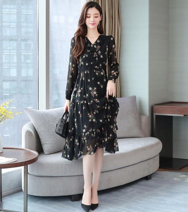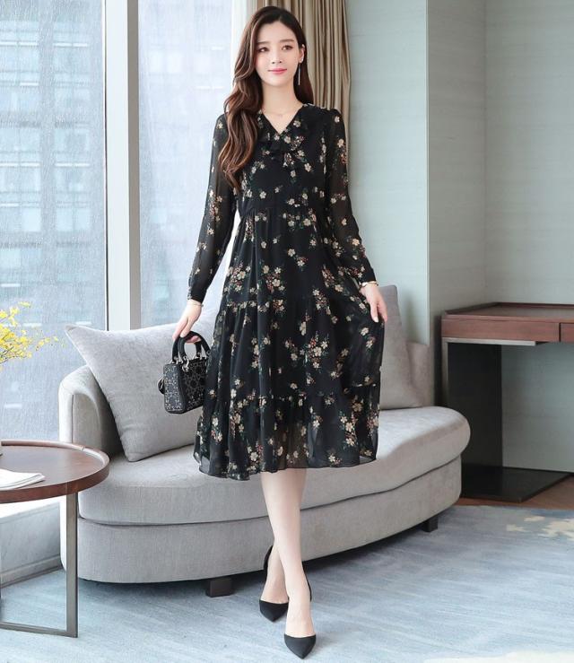 ワンピース レディース 40代 きれいめ 長袖 上品 春秋 膝丈ワンピース Vネック 花柄 シフォン 大きいサイズ パーティードレス 韓国風 おしゃれ 通勤 着痩せ 新品