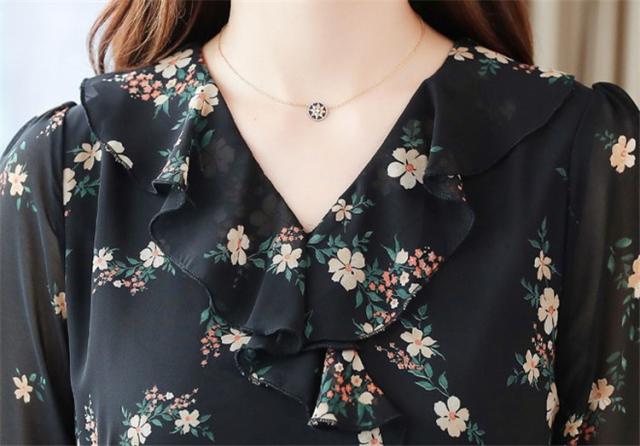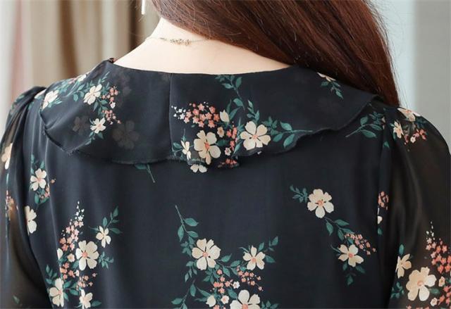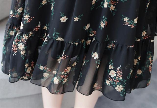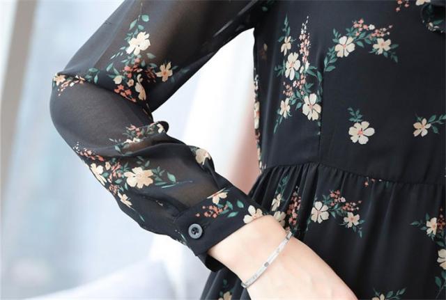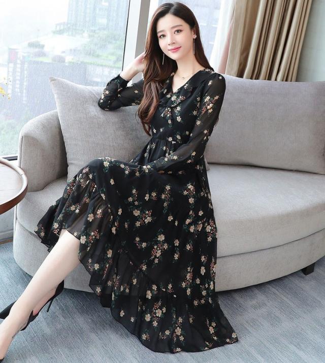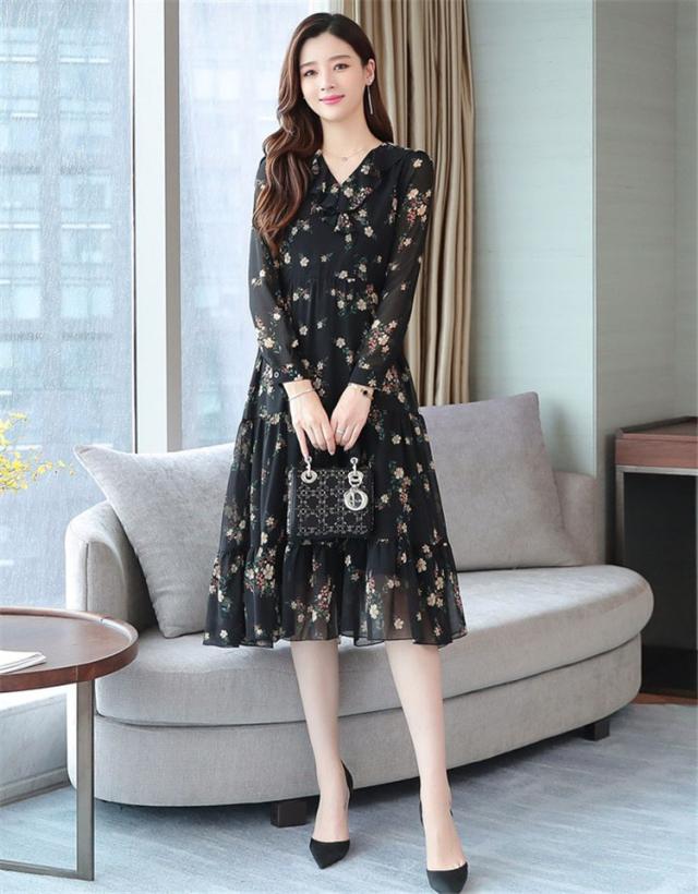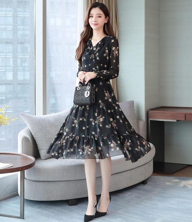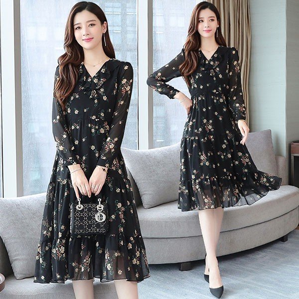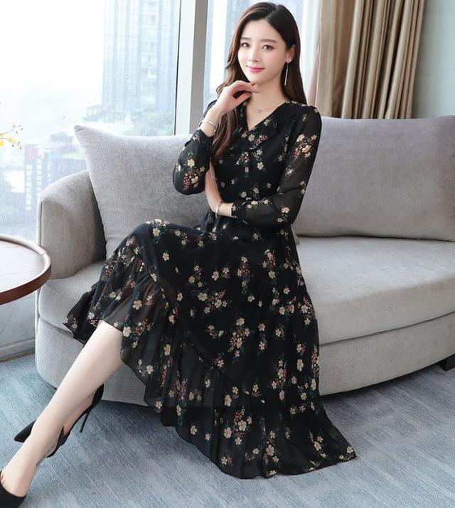 ワンピース レディース 40代 きれいめ 長袖 上品 春秋 膝丈ワンピース Vネック 花柄 シフォン 大きいサイズ パーティードレス 韓国風 おしゃれ 通勤 着痩せ 新品
