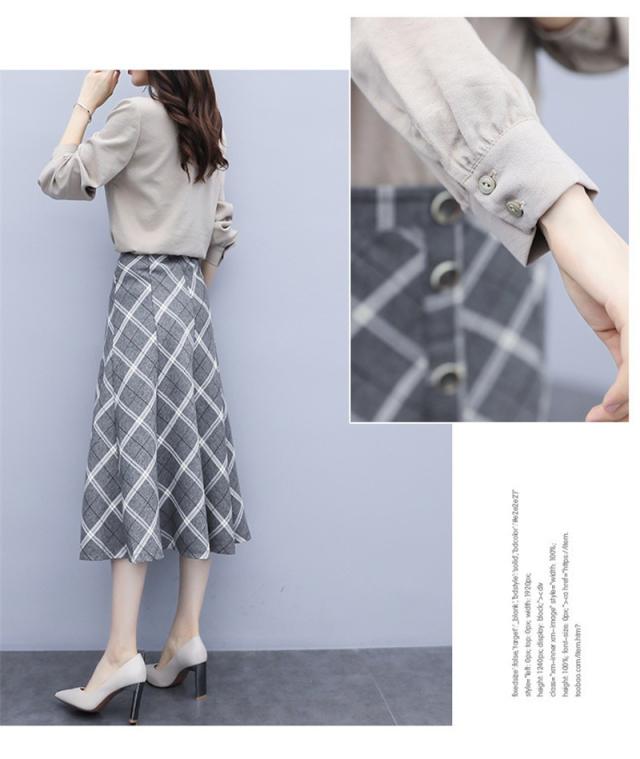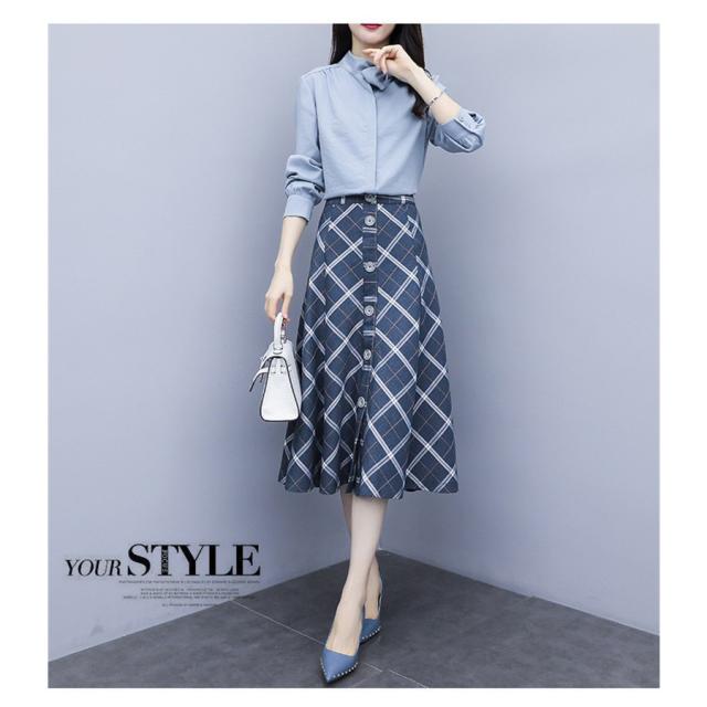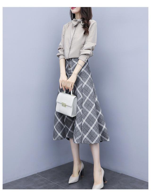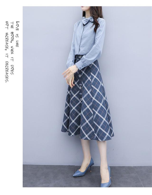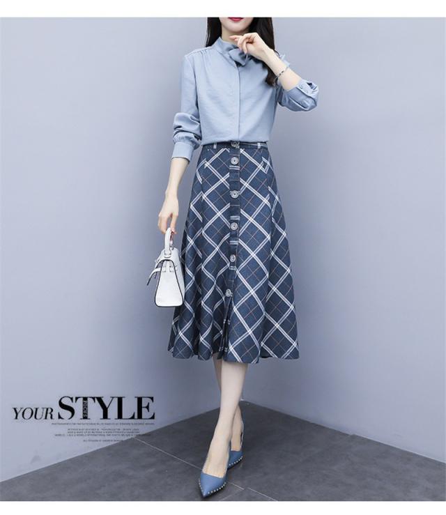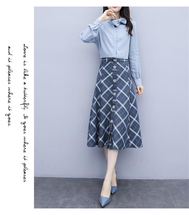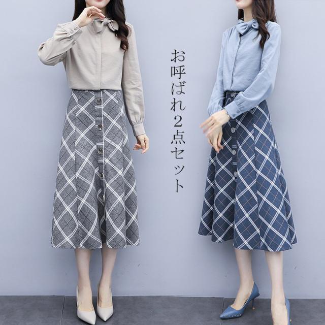 セットアップ 2点セット レディース 秋 トップス 長袖 シャツ スカート チェック柄 フォーマル aライン OL お呼ばれ 結婚式 入学式 50代