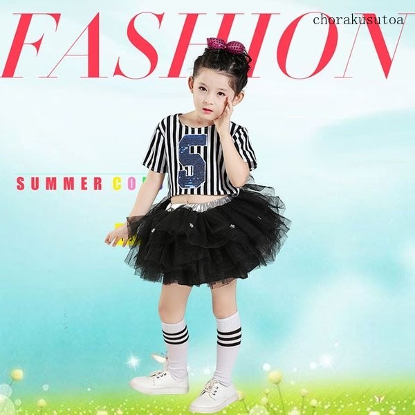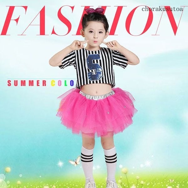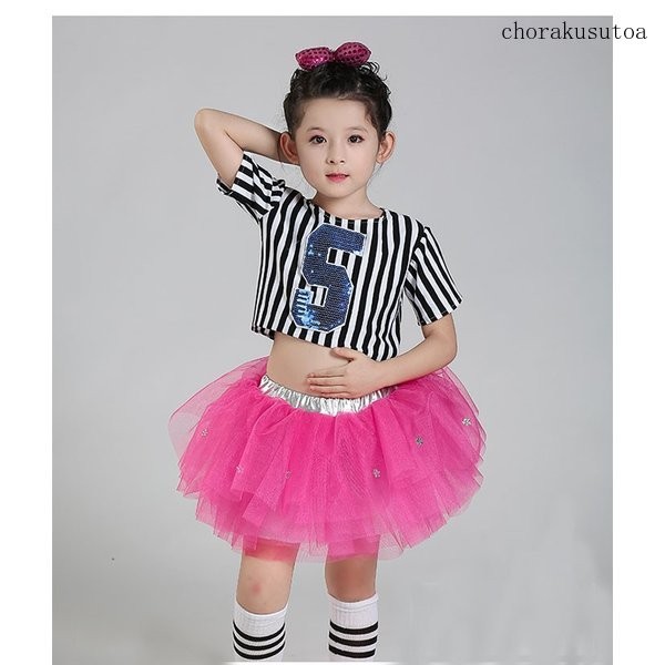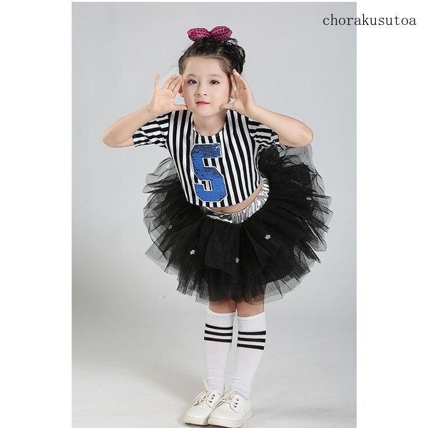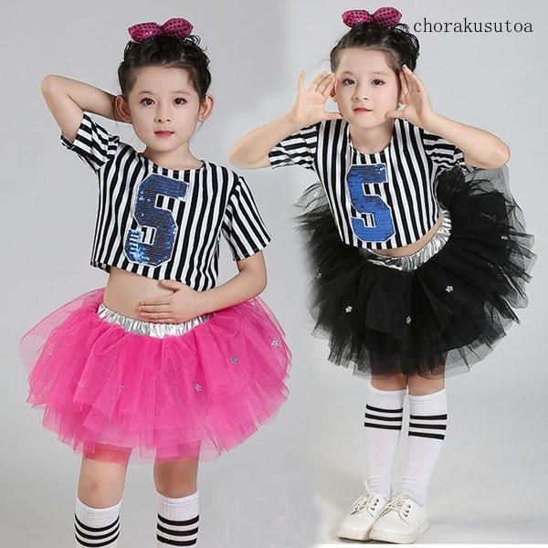 キッズダンス衣装 チアガール衣装 スパンコール ストライプ柄トップス チュールスカート ダンスウエア ジャズ ステージ服 演出服 イベント 発表会