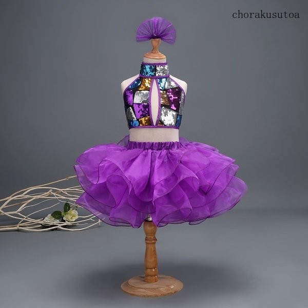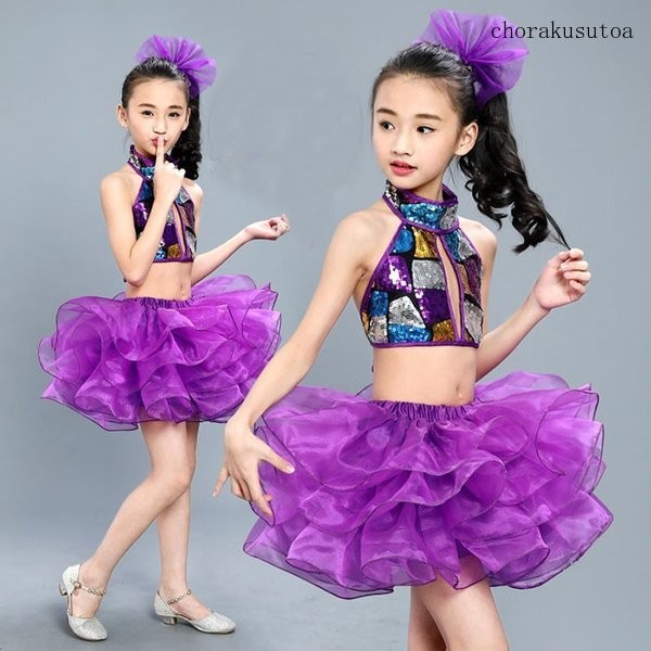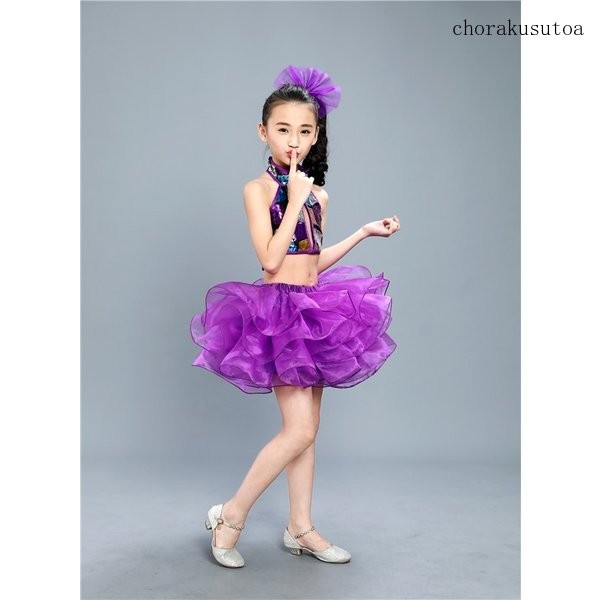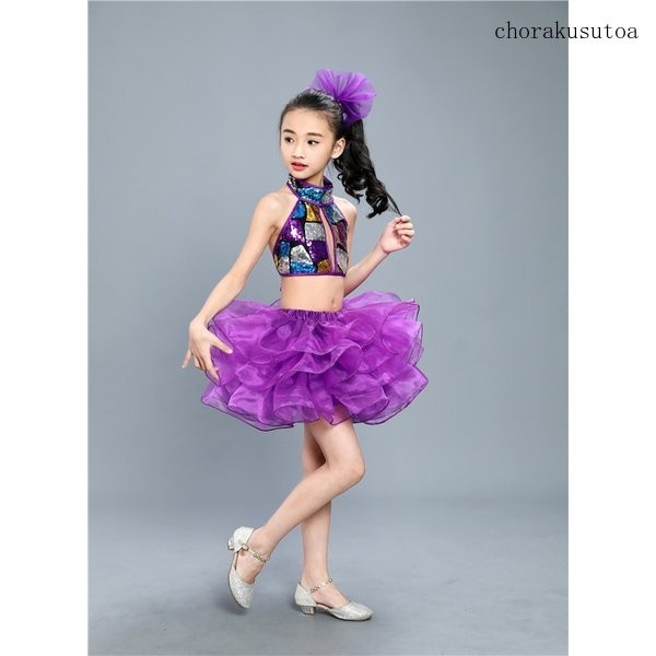 子供演出服 ダンス衣装 女の子 チアガール衣装 チュールスカート スパンコールトップス ジャズダンス 社交ダンス ステージ服