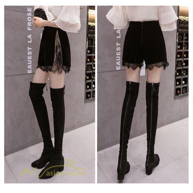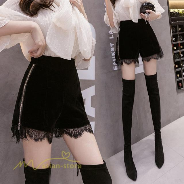 短パン ショーパン レディース Aラインパンツ ショートパンツ カジュアル ヒップアップ ハイウエスト 後ろファスナー付き 裾口レース シルエット 着痩せ