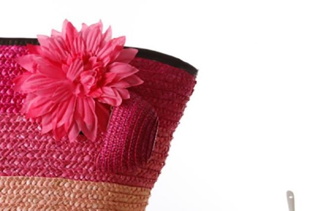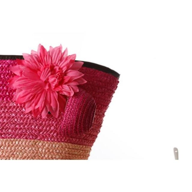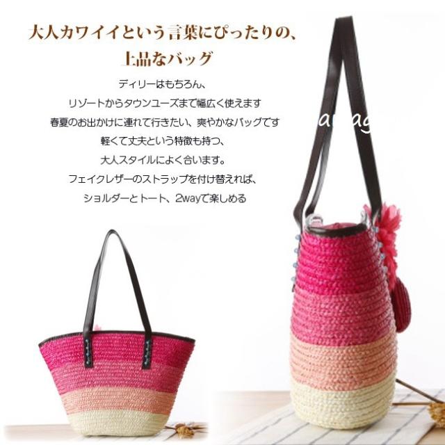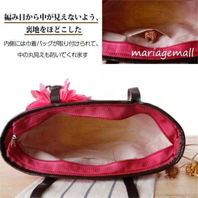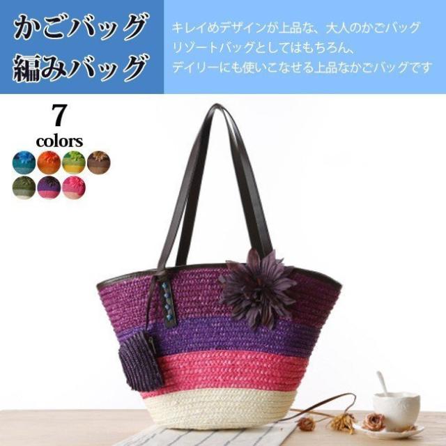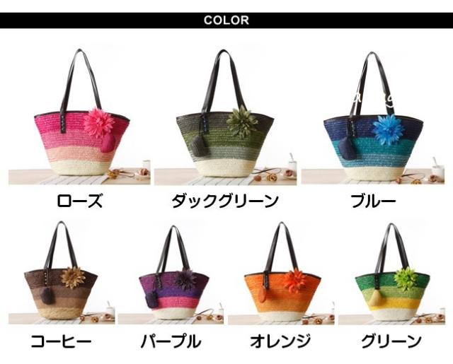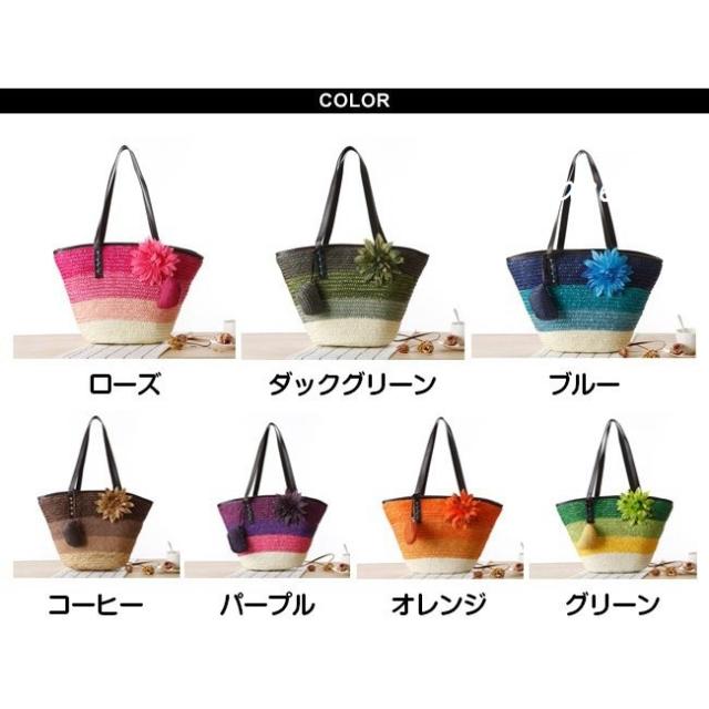 かごバッグ レディース トートバッグ カラー 配色 カラフル 花飾り ポーチ付き ファスナー付き 大きめ 大容量 ストローバッグ リゾート ハワイ