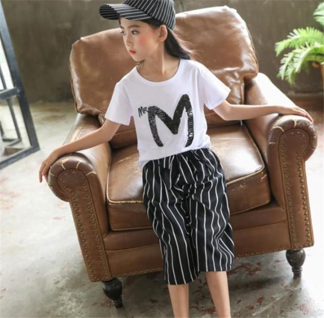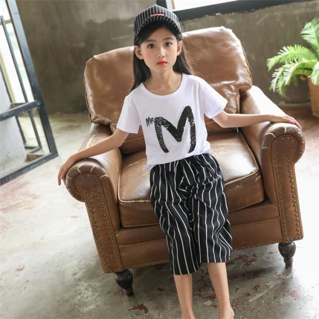 子供服 セットアップ キッズ 女の子 夏 2点セット 上下セット Tシャツ 半袖 ガウチョパンツ ストライプ ジュニア おしゃれ 可愛い カジュアル 小学生 新品 150