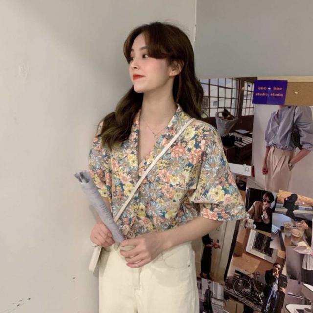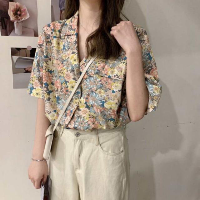 リバティプリント開襟シャツ レディース 半袖シャツ 小花柄 オープンカラー 韓国ファッション ベルシー フラワー柄 開衿シャツ