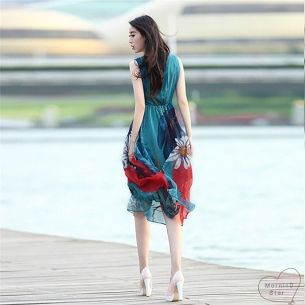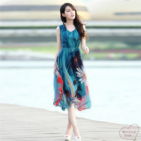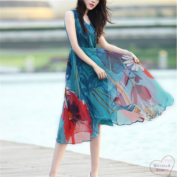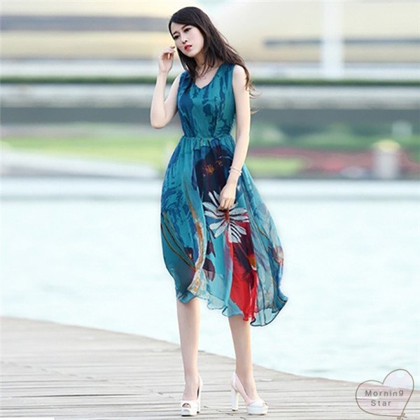 リゾートワンピ花柄大人 きれいめレディースワンピースノースリーブロングマキシ丈シフォンフレアおしゃれかわいい 膝丈ひざ丈可愛い