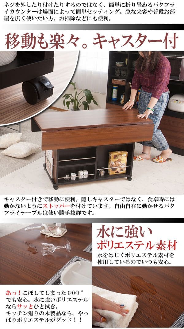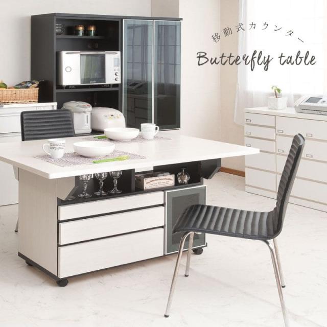 ダイニングテーブル バタフライ 2人用 ワゴン 日本製 一人暮らし 引き出し 幅120 折りたたみ 完成品 棚 収納 木製 国産 木目 白 スリム キャスター おしゃれ