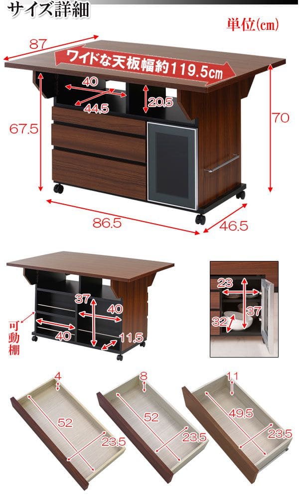■商品サイズ/本体:(約)幅119.5×奥行(閉じ時)55(片バタ時)71(両バタ時)87×高さ70(キャスター含む)cm