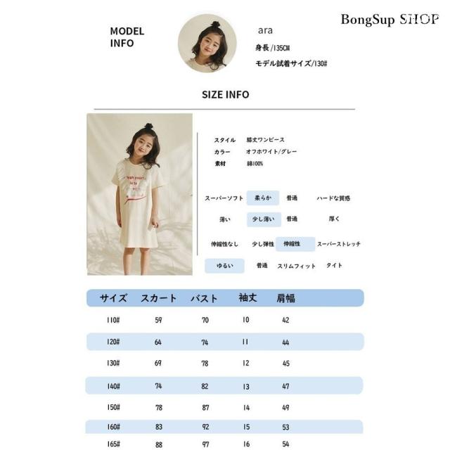 | サイズについての説明 | 【110】ワンピース丈/59 バスト/70 肩幅/42 袖丈/10(cm) 【120】ワンピース丈/64 バスト/74 肩幅/44 袖丈/11(cm) 【130】ワンピース丈/69 バスト/78 肩幅/45 袖丈/12(cm) 【140】ワンピース丈/74 バスト/82 肩幅/47 袖丈/13(cm) 【150】ワンピース丈/78 バスト/87 肩幅/49 袖丈/14(cm) 【160】ワンピース丈/83 バスト/92 肩幅/53 袖丈/15(cm) 【165】ワンピース丈/88 バスト/97 肩幅/54 袖丈/16(cm) |