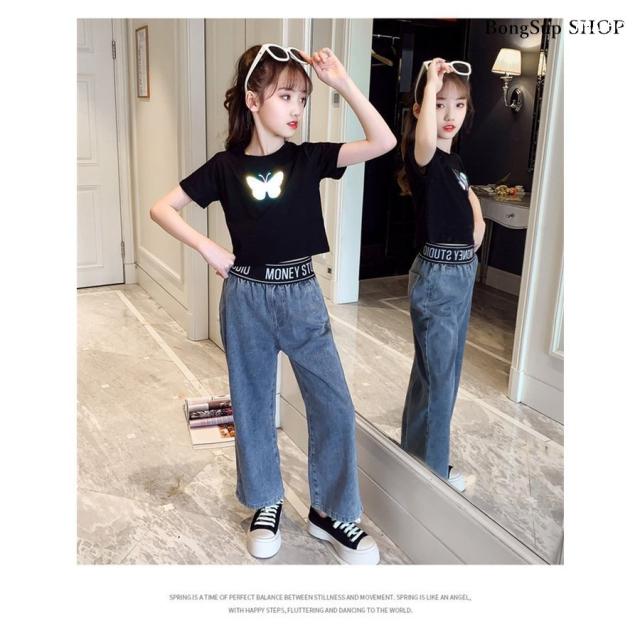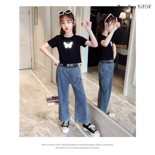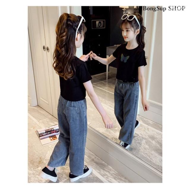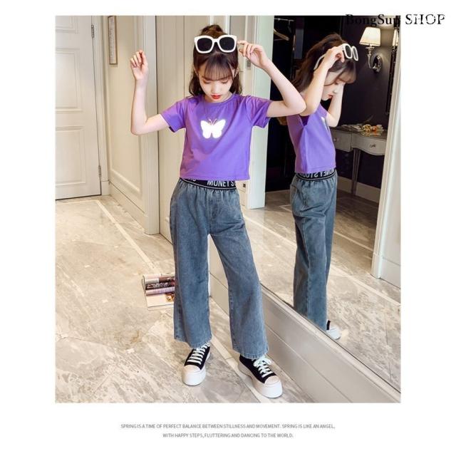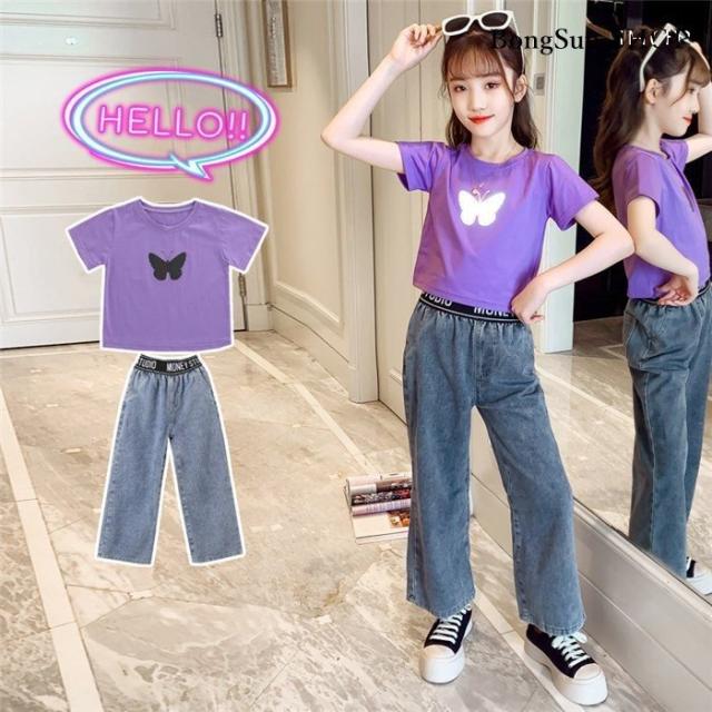 子供服 セットアップ キッズ 女の子 半袖 2点セット 上下セット Tシャツ 薄手 デニムパンツ カジュアル 可愛い ジャージ 新品