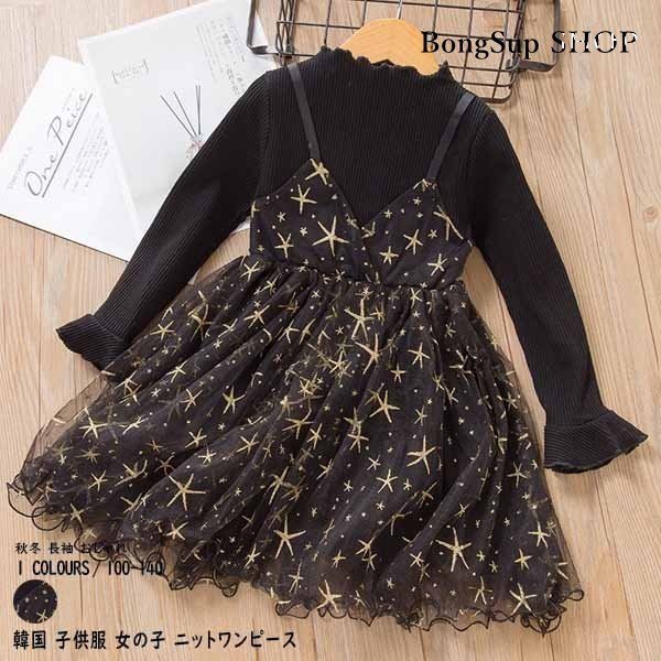 韓国 子供服 女の子 ニットワンピース 秋冬 長袖 おしゃれ 子どもドレス 全一色 星柄 ワンピース 発表会 七五三 100-140