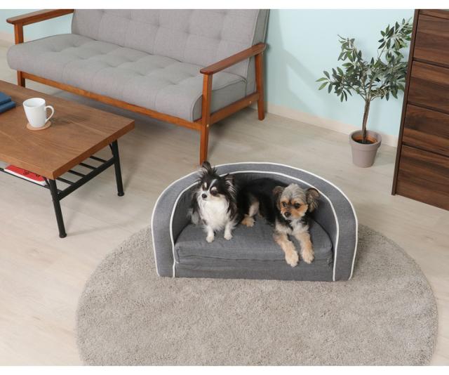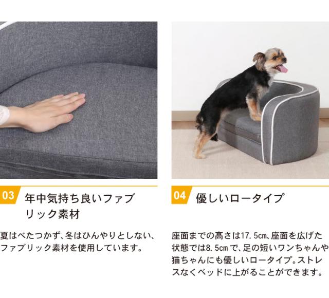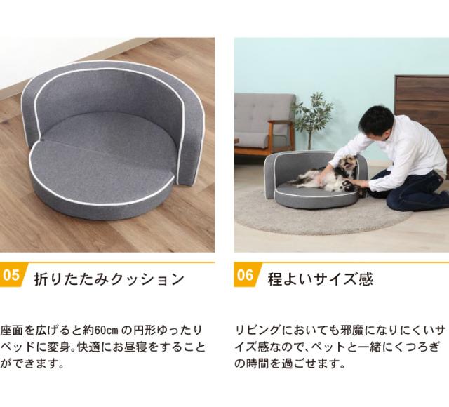 グレー色のシンプルデザインがお部屋になじみやすく、ホールド感を感じさせる背もたれの曲線はペットの快適なスペースに。背もたれや脇のクッションにあごを乗せたり好きな姿勢で思う存分くつろげます。夏はべたつかず、冬はひんやりとしない、ファブリック素材を使用しています。座面までの高さは17.5cm、座面を広げた状態では8.5cmで、足の短いワンちゃんや猫ちゃんにも優しいロータイプ。ストレスなくベッドに上がることができます。座面を広げると約60cmの円形ゆったりベッドに変身。快適にお昼寝をすることができます。リビングにおいても邪魔になりにくいサイズ感なので、ペットと一緒にくつろぎの時間を過ごせます。