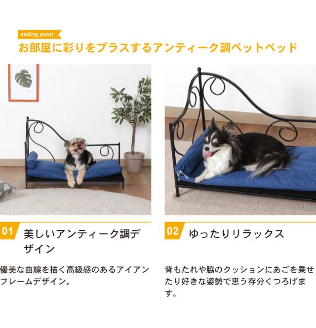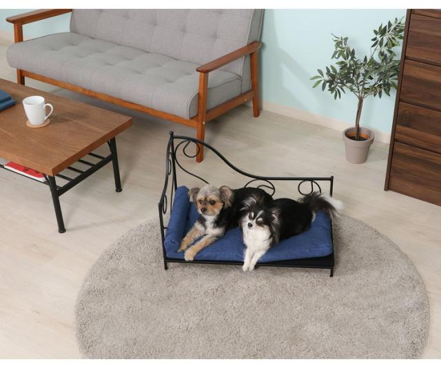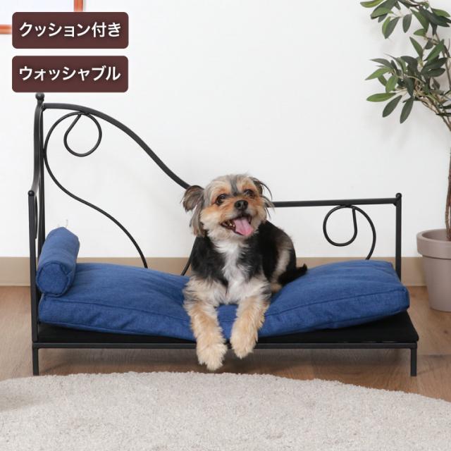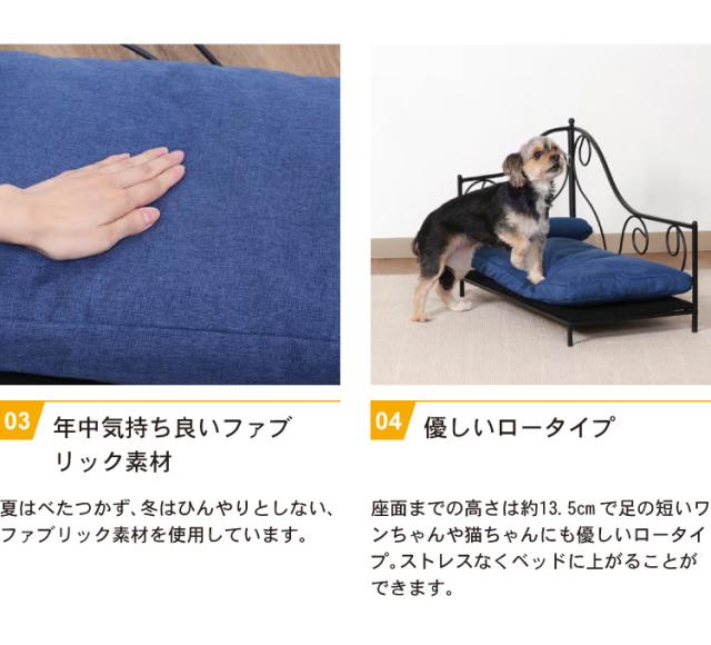 優美な曲線を描く高級感のあるアイアンフレームデザイン。背もたれや脇のクッションにあごを乗せたり好きな姿勢で思う存分くつろげます。夏はべたつかず、冬はひんやりとしない、ファブリック素材を使用しています。座面までの高さは約13.5cmで足の短いワンちゃんや猫ちゃんにも優しいロータイプ。ストレスなくベッドに上がることができます。小さなピローはあご置きやおもちゃとしてお使いいただけます。またクッションや座面部分は手洗いできるので衛生面も安心です。リビングにおいても邪魔になりにくいサイズ感なので、ペットと一緒にくつろぎの時間を過ごせます。