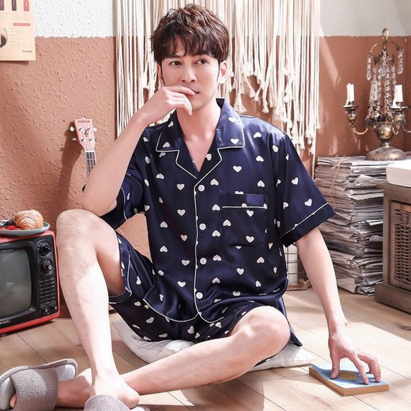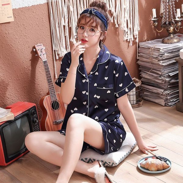 【セール】カップルペアルック 夏 半袖 ショートパンツ パジャマ 前開き上下セット 絹パジャマ ハート柄 レディース メンズ ルームウエア