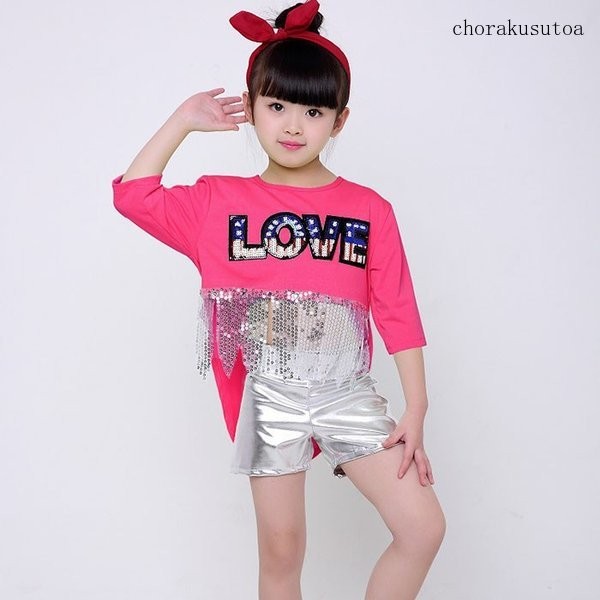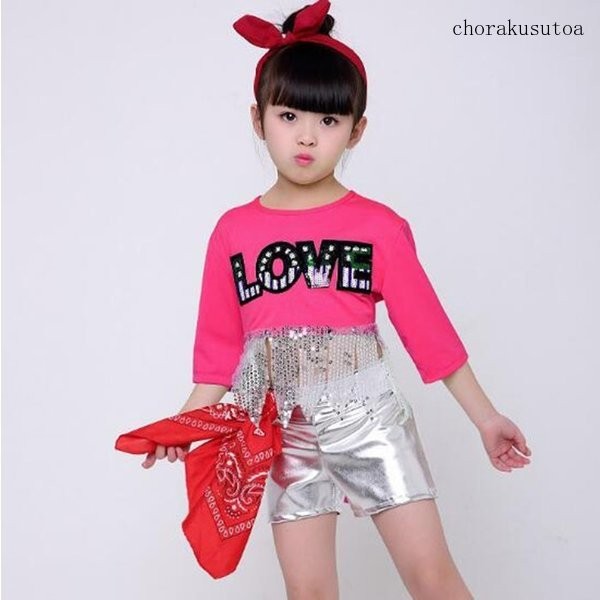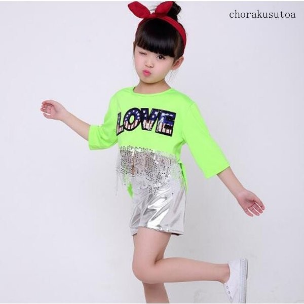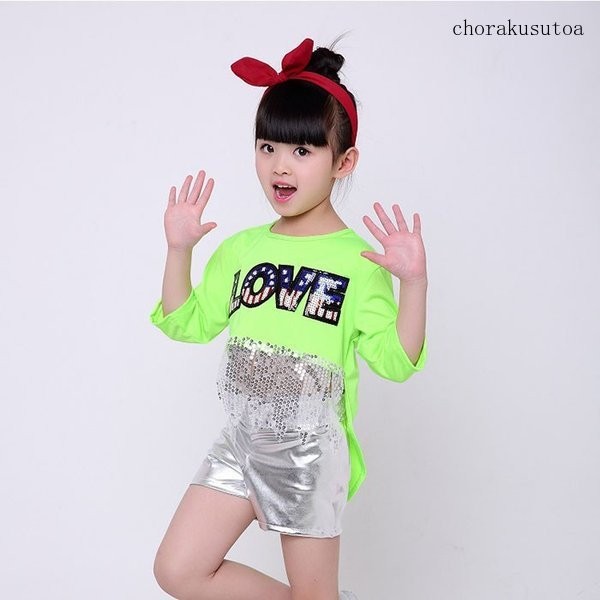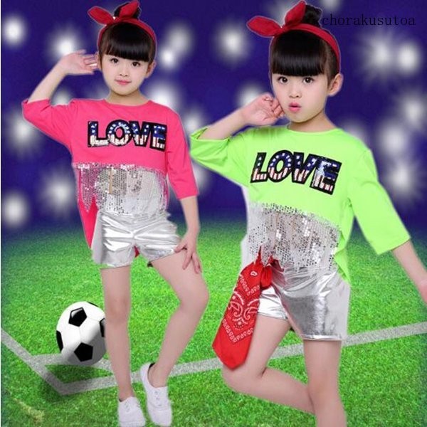 子供チアガール衣装 チア上下衣装 キッズダンス 文字柄 スパンコール 女の子 ヒップホップ ダンス衣装 学園祭 運動会 演奏会 応援団