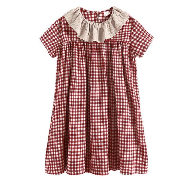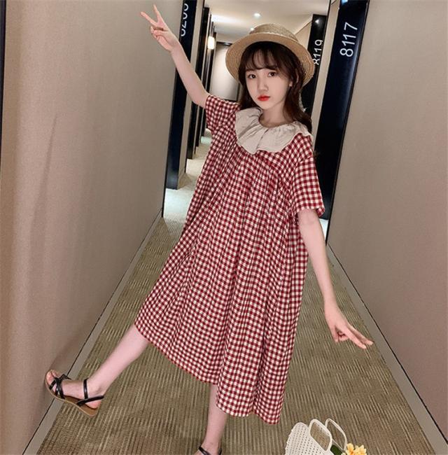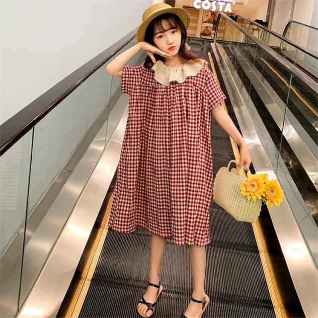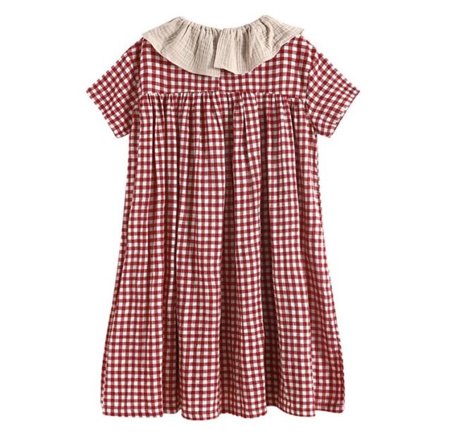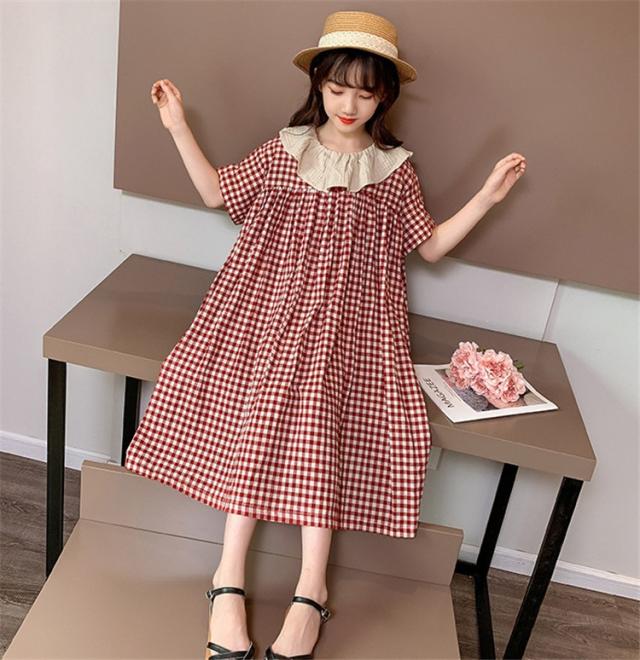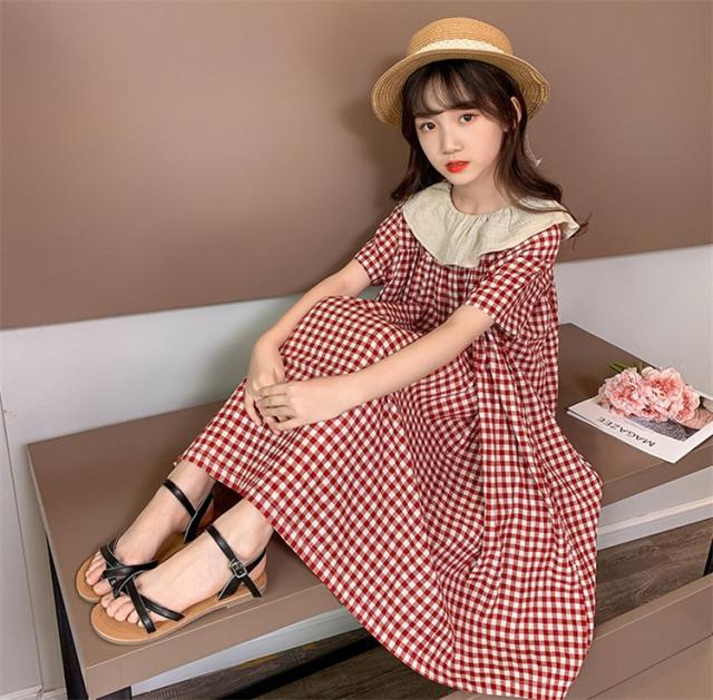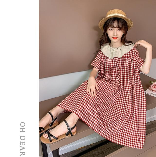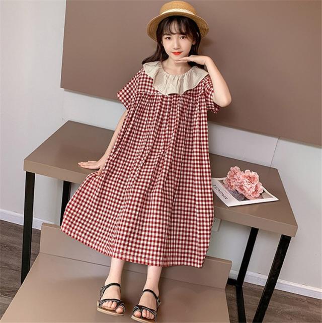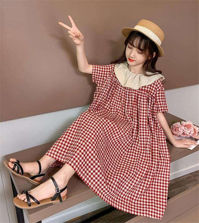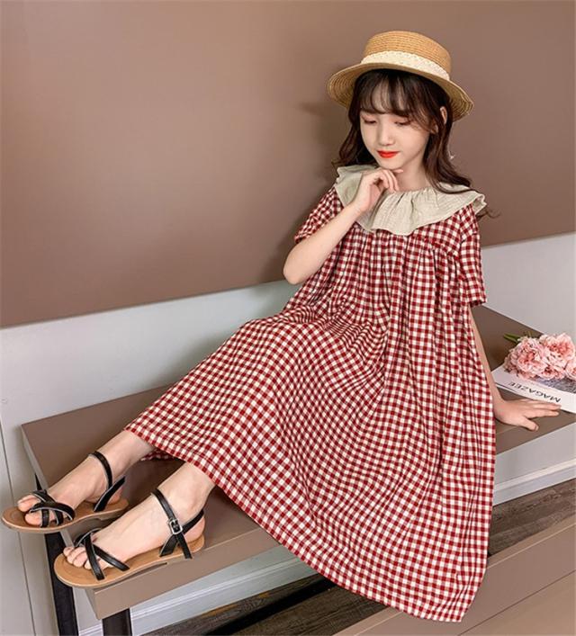 ワンピース キッズ 子供服 女の子 夏 キッズワンピース 半袖ワンピース 綿 チェック柄 折り襟 子供ドレス ジュニア お姫様 おしゃれ 可愛い カジュアル 新品