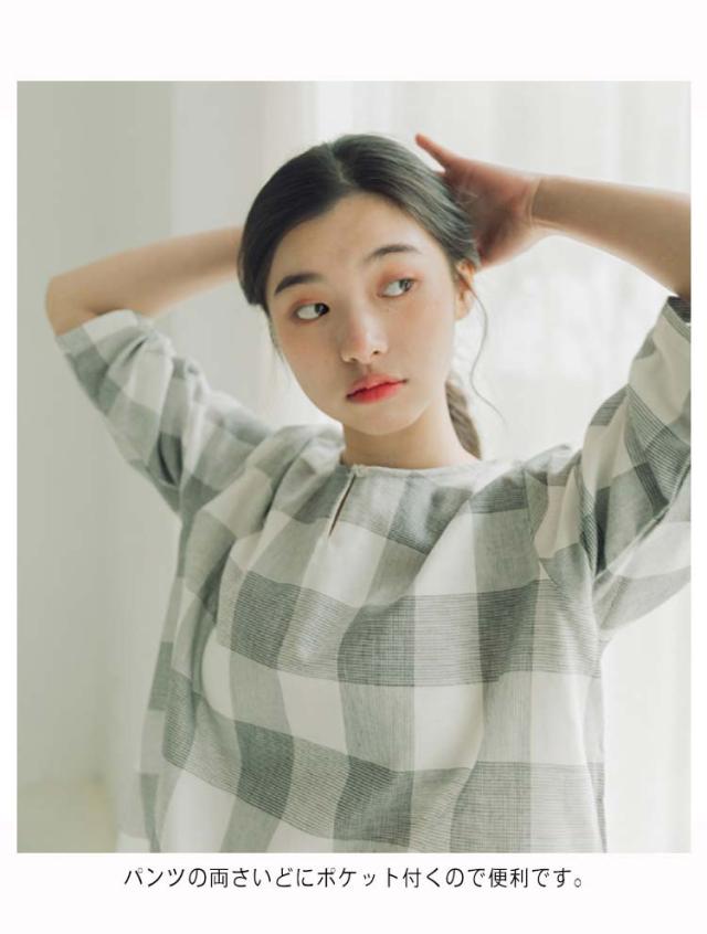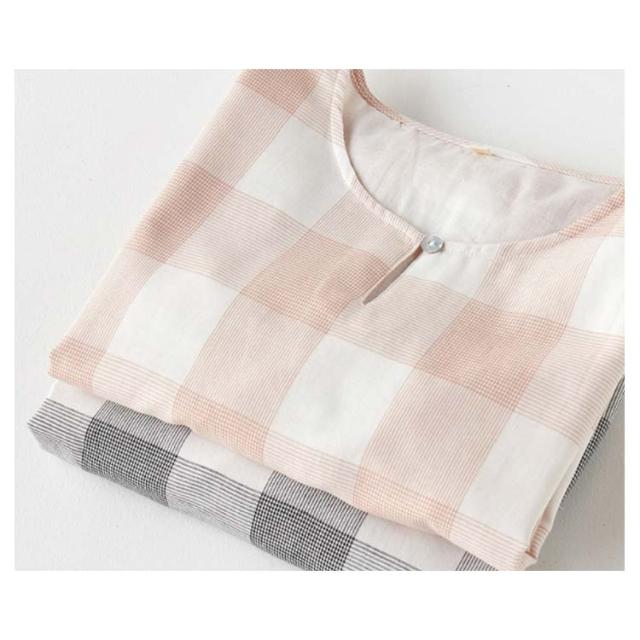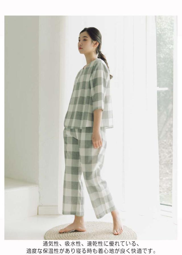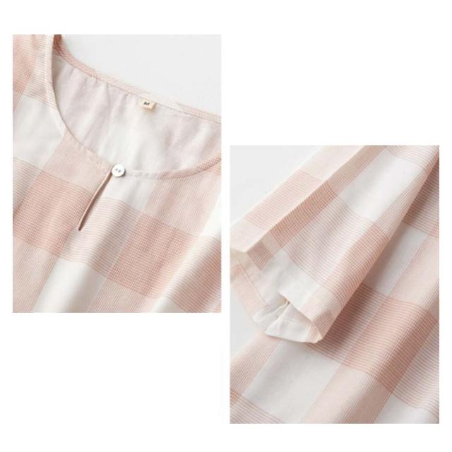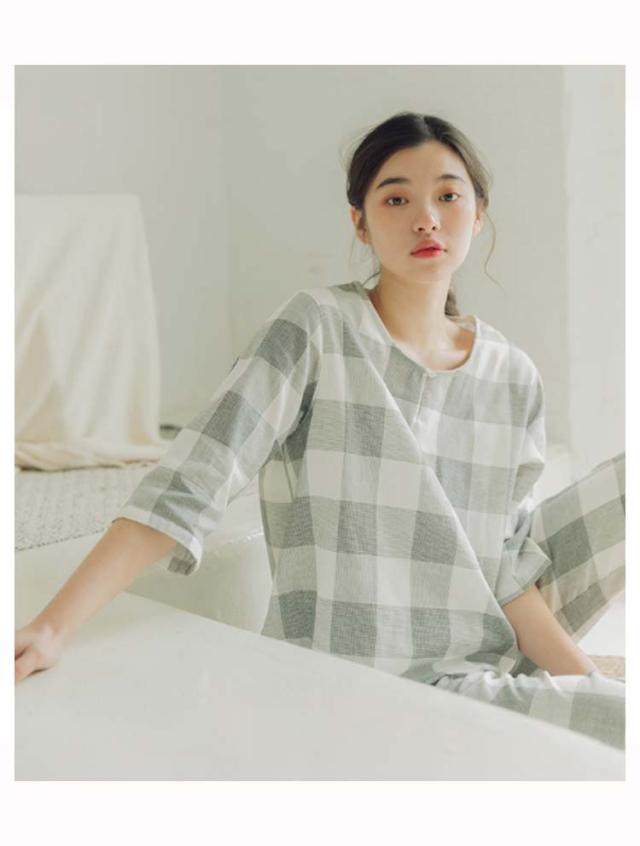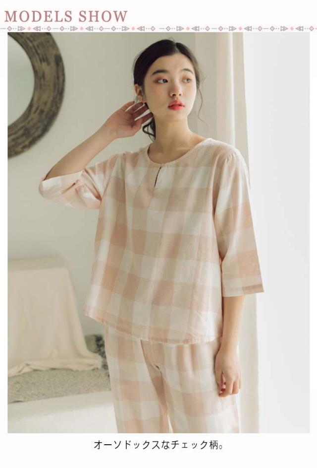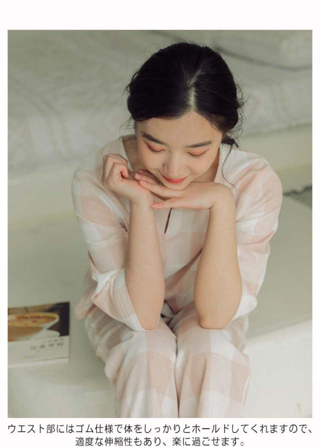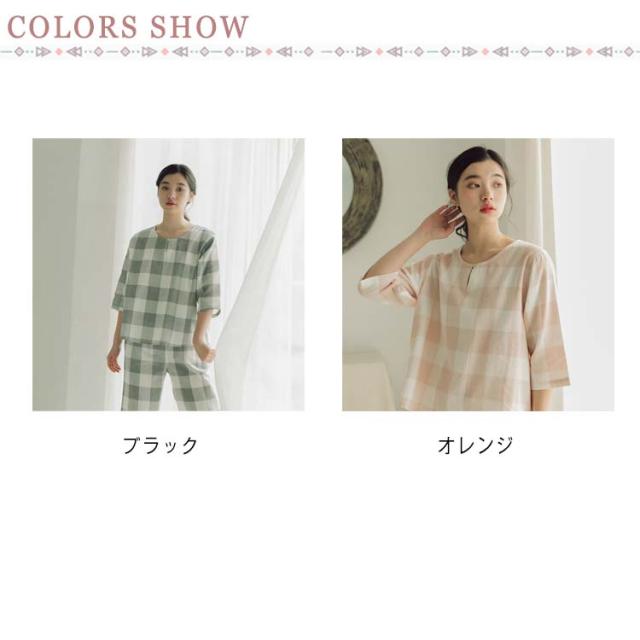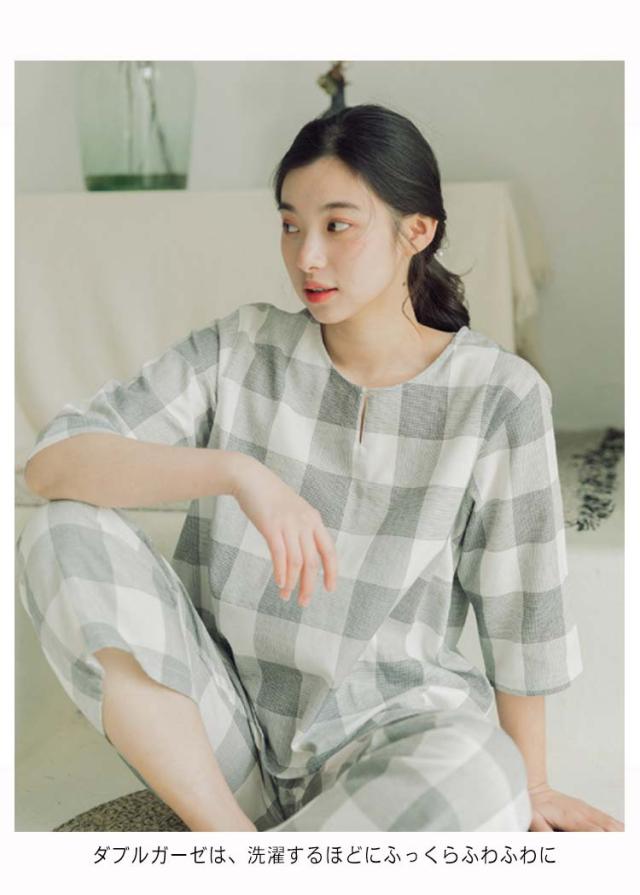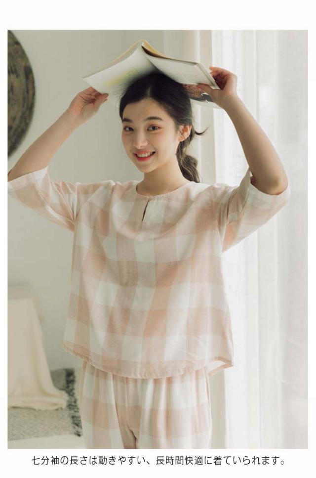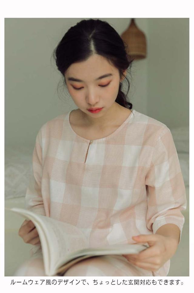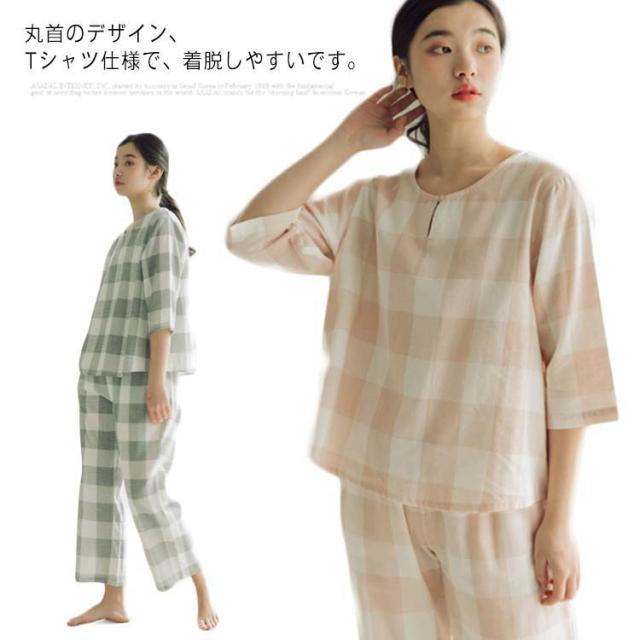 | 丸首のデザイン、Tシャツ仕様で、着脱しやすいです。 オーソドックスなチェック柄。 ルームウェア風のデザインで、ちょっとした玄関対応もできます。 七分袖の長さは動きやすい、長時間快適に着ていられます。 ウエスト部にはゴム仕様で体をしっかりとホールドしてくれますので、適度な伸縮性もあり、楽に過ごせます。 パンツの両さいどにポケット付くので便利です。 ダブルガーゼは、洗濯するほどにふっくらふわふわに 通気性、吸水性、速乾性に優れている、適度な保温性があり寝る時も着心地が良く快適です。 | |