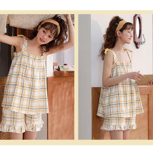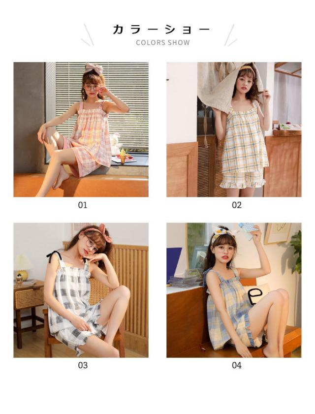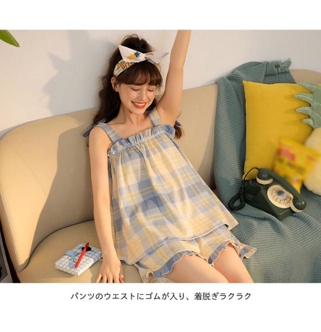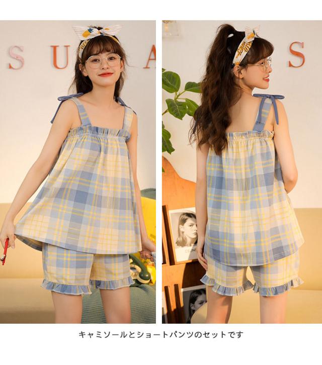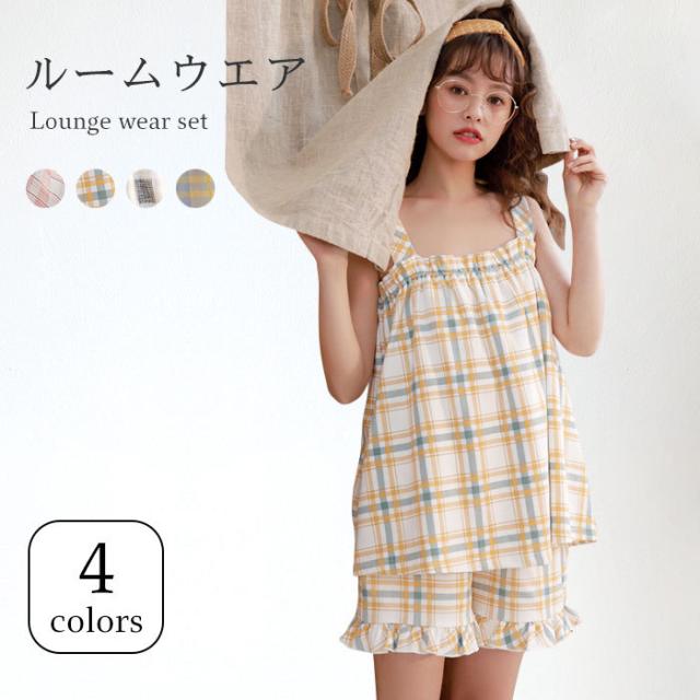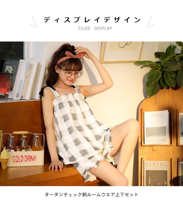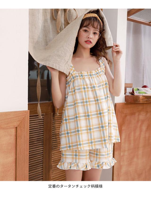 タータンチェック レディース ルームウエア 上下セット ナイトウエア 寝間着 部屋着 キャミソール ショートパンツ フリル付き