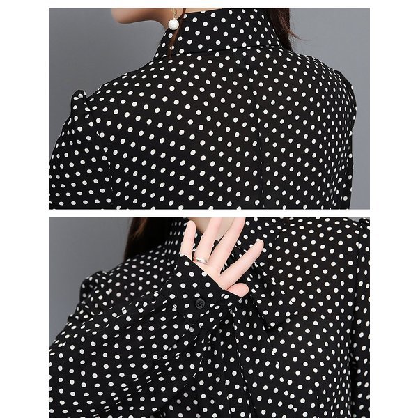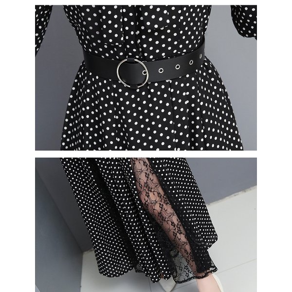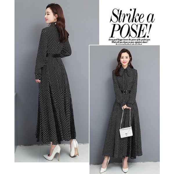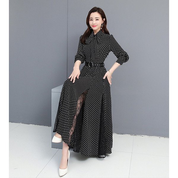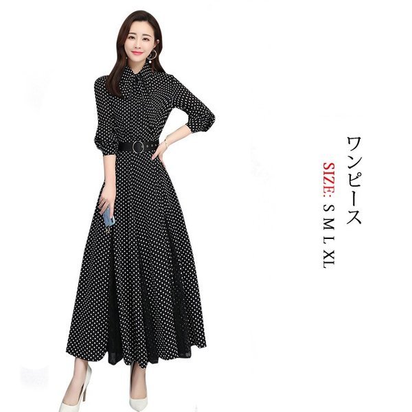 【セール】ワンピース レディース ロング丈 大人 上品 面接 結婚式 入学式 ドット柄 レース 透け感 リボン付き ベルト 長袖 蝶結び