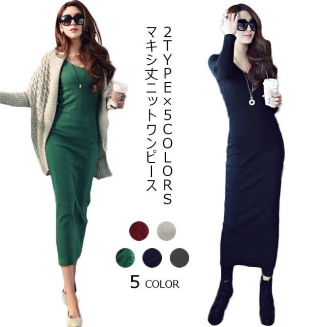 ニットワンピース レディース 長袖 マキシ丈 ロング丈 無地 リブ編み オールインワン 秋 冬 春 2020秋冬新作