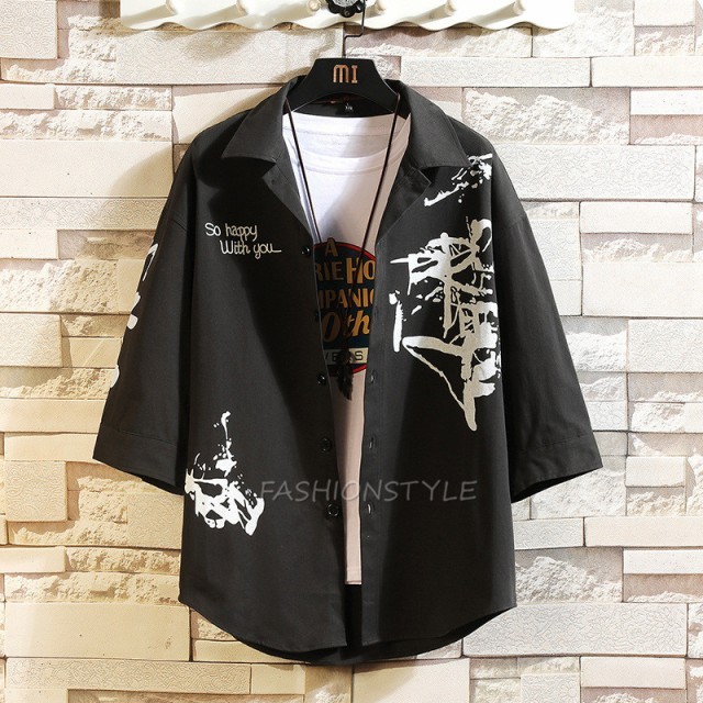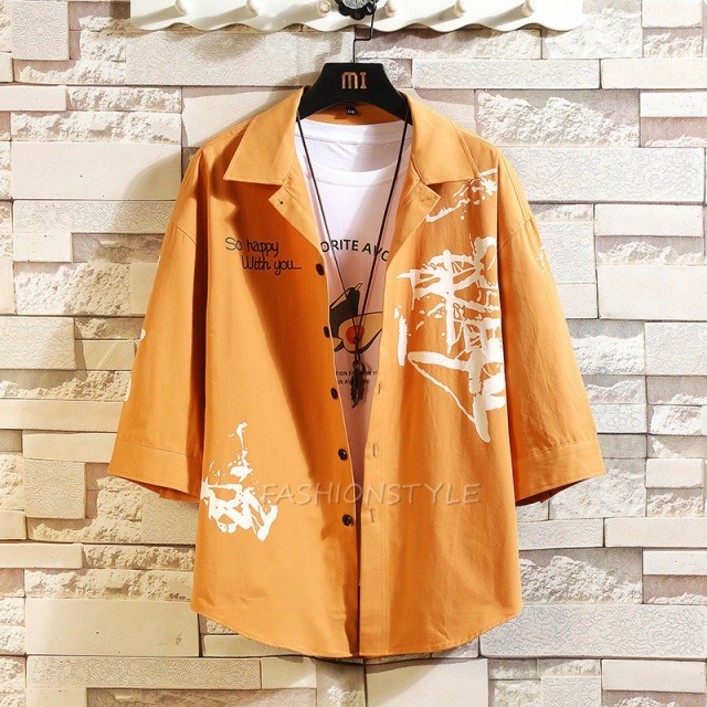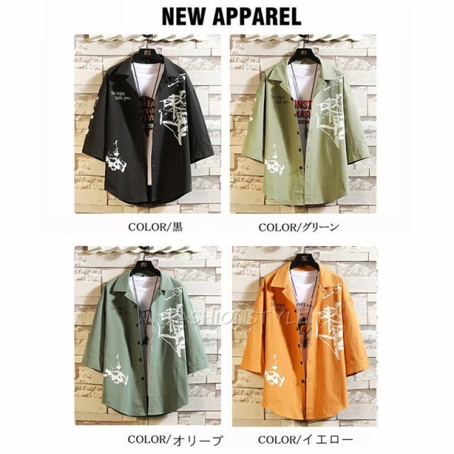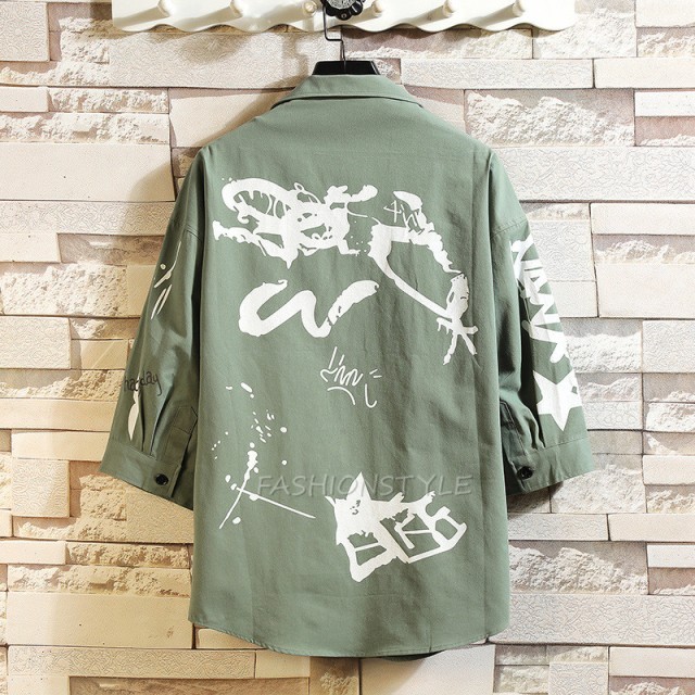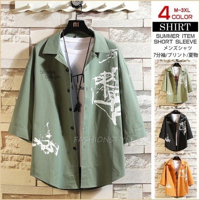 カジュアルシャツ メンズ シャツ 7分袖 トップス ワークシャツ プリント コットンシャツ 七分袖 メンズファッショ