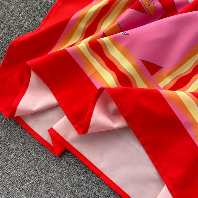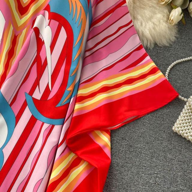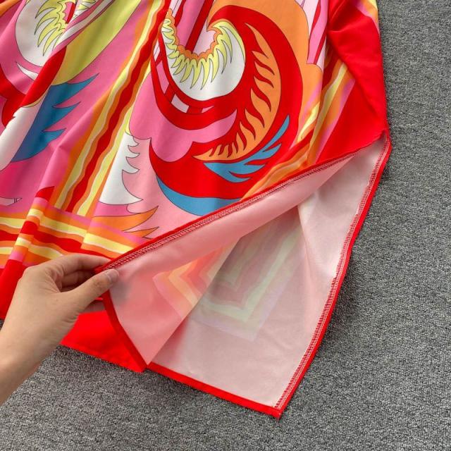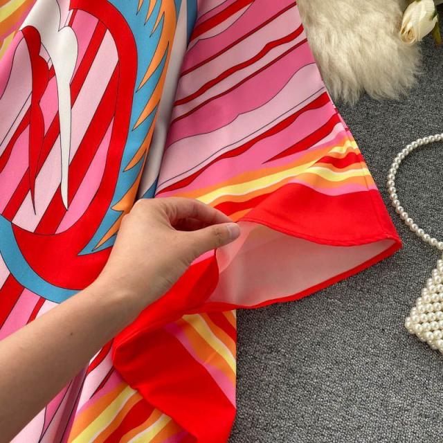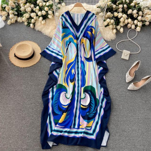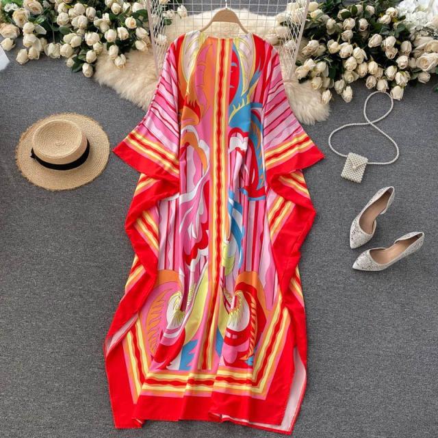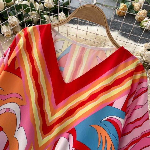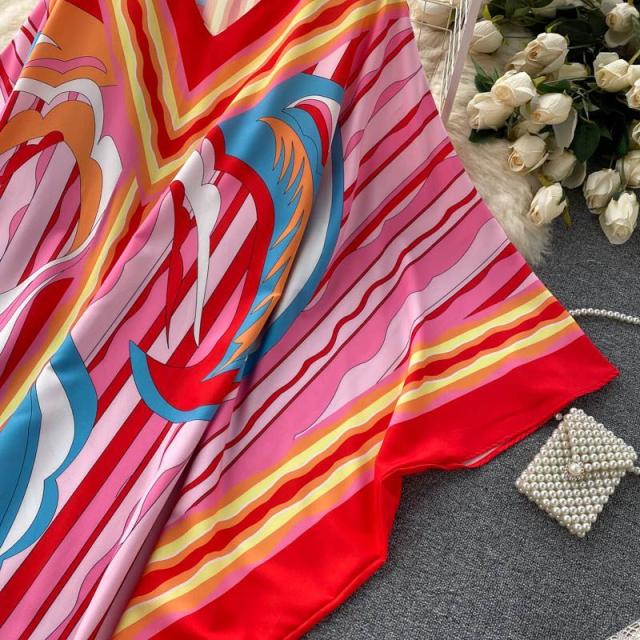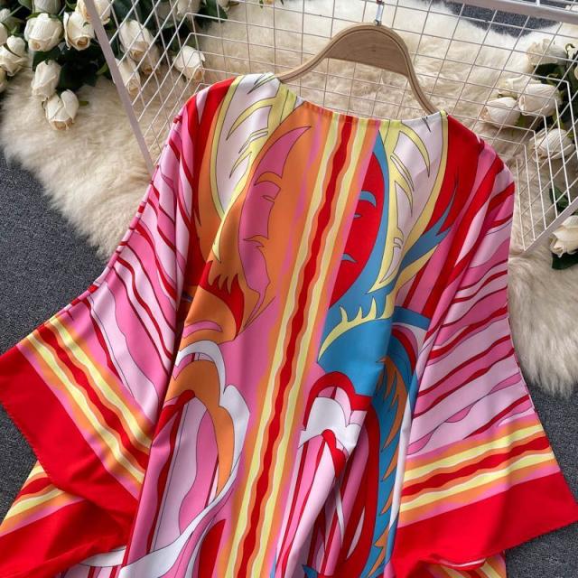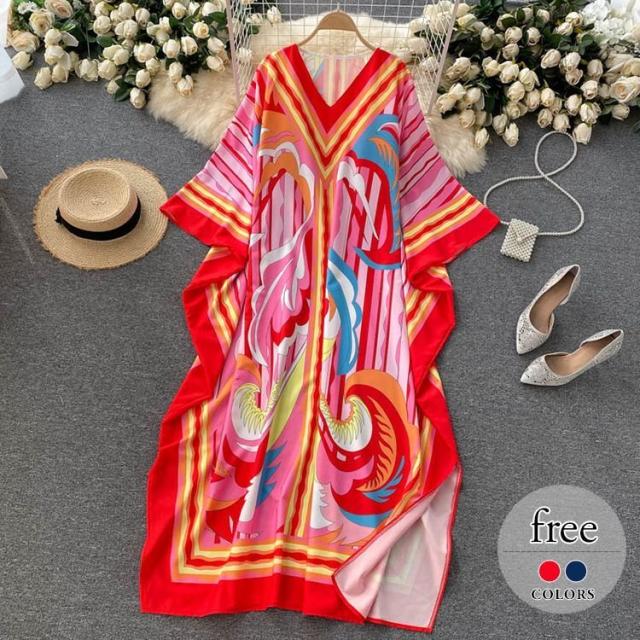 ワンピース プリント柄 抽象柄 Vネック 袖ゆったり アジアンテイスト カジュアル 食事会 大人カジュアル デート ドライブ 学校行事 派手
