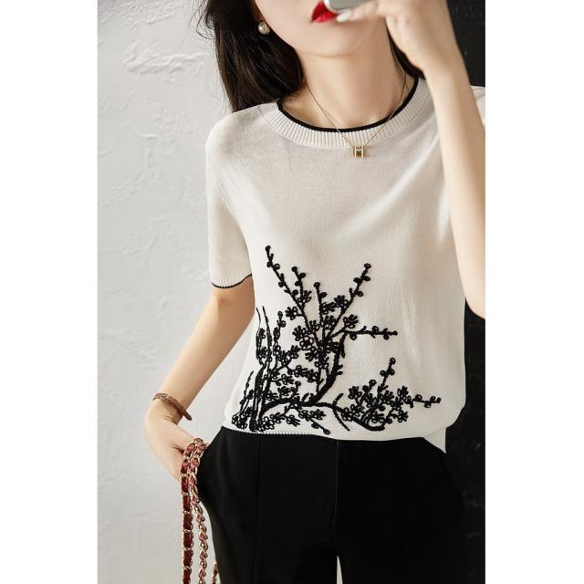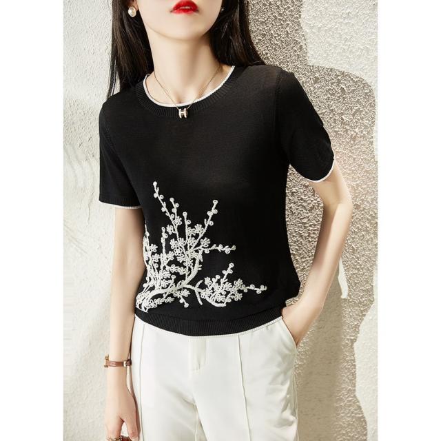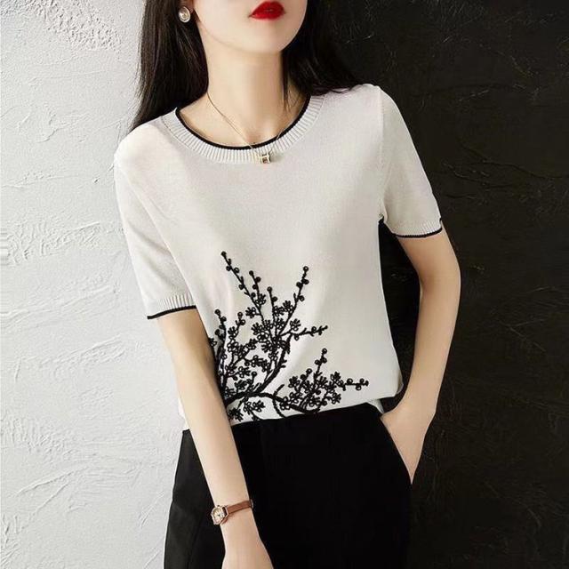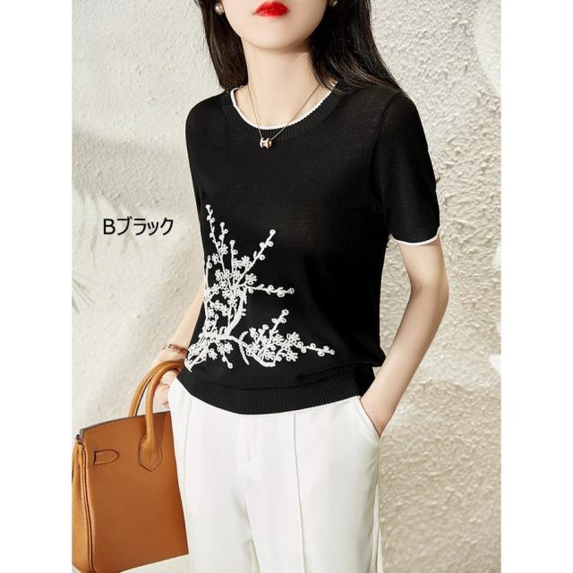 Tシャツ レディース 40代 春夏新作 オシャレブラウス 薄手ニットソー 半袖トップス 白刺繍Tシャツ レション 大人 通勤 ゆったりカットソー 韓国風 30代 50代