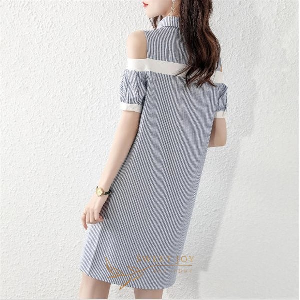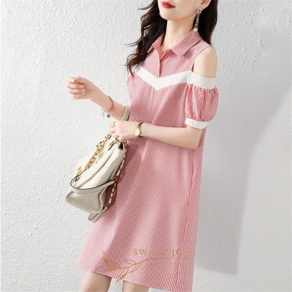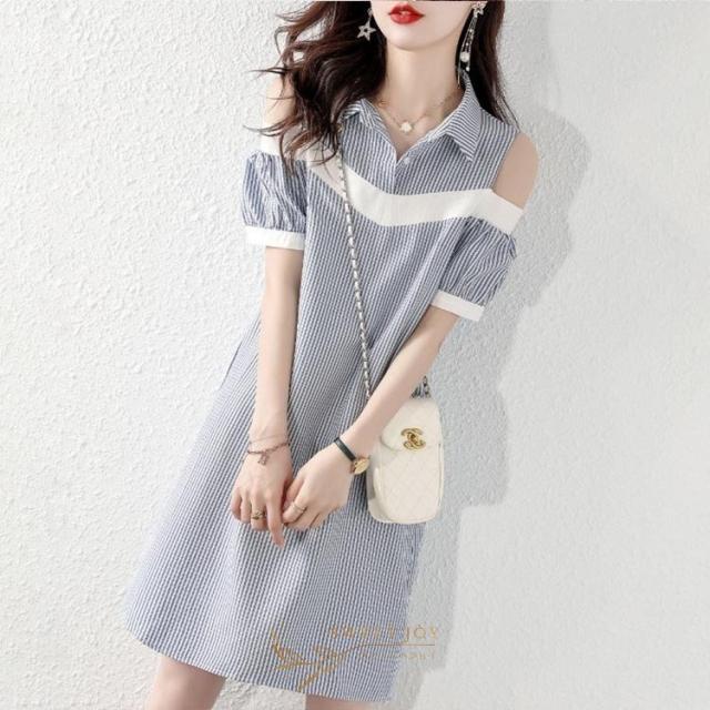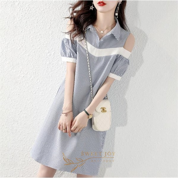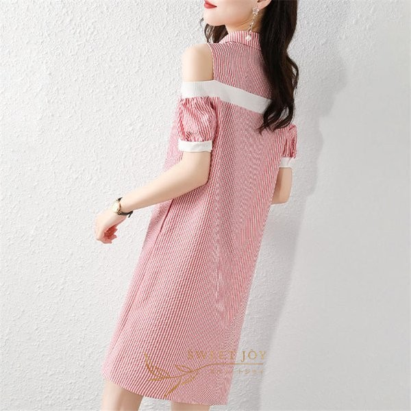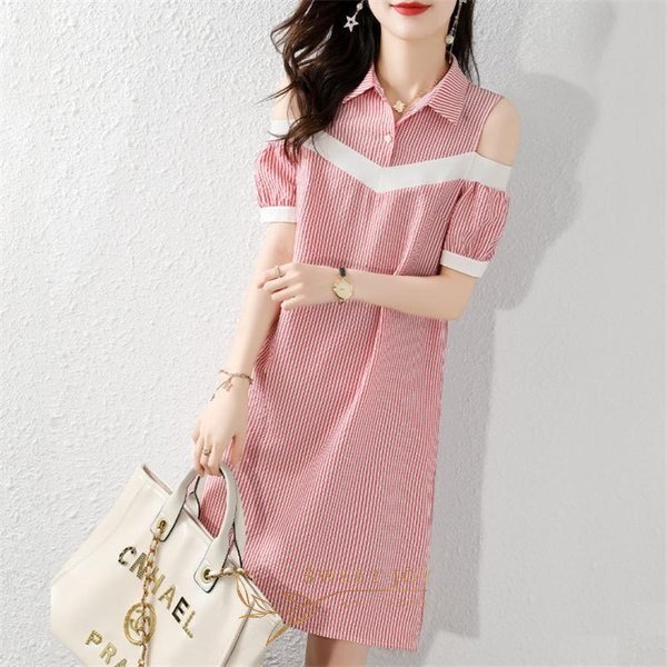 シャツワンピース レディース 40代 キレイめ マキシ丈ワンピース 春夏 肩出し 半袖ワンピース ボーダー柄 通勤ドレス オシャレ 上品 着痩せ 2色